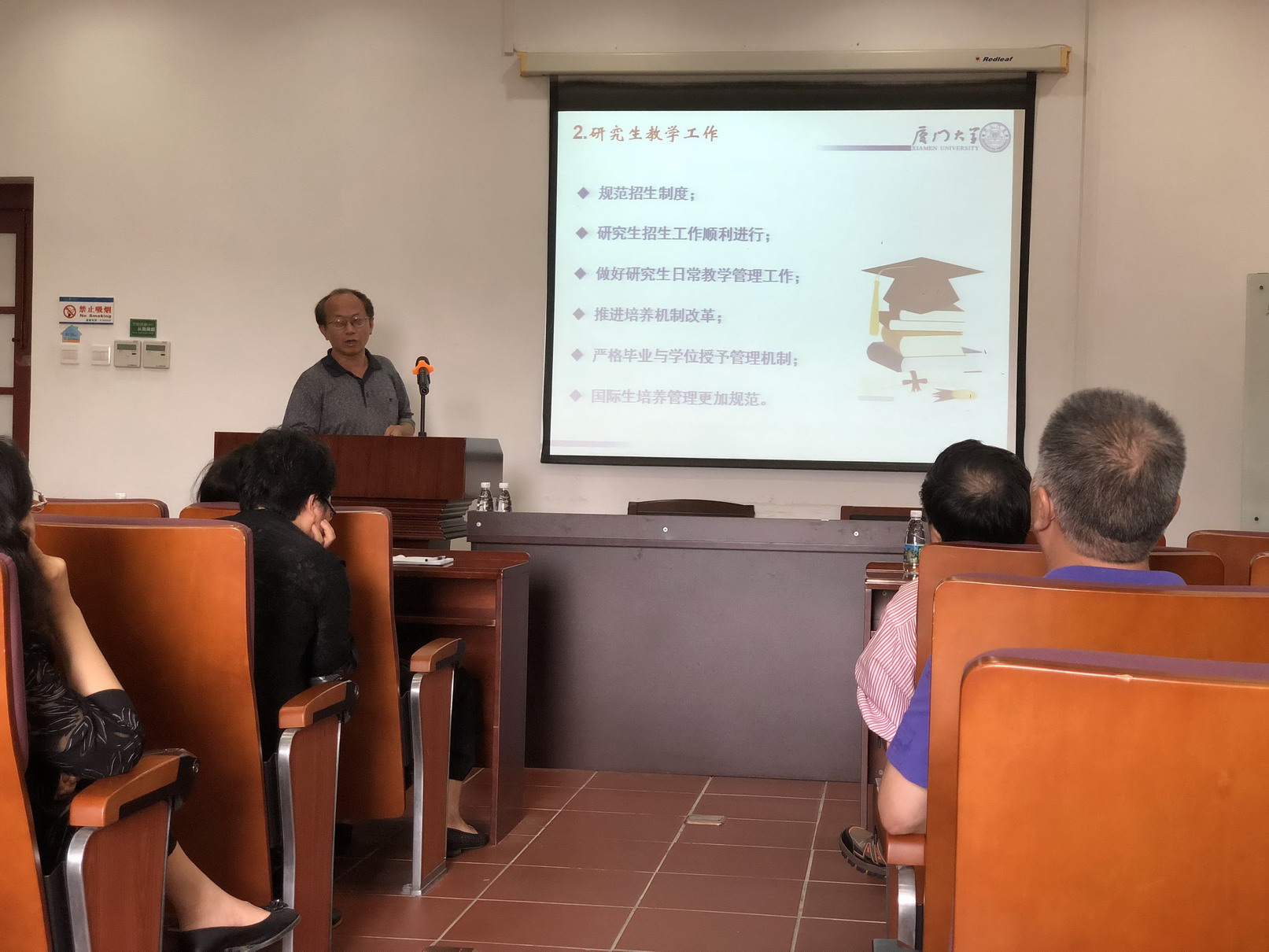 首先,院长李一平教授代表学院党政领导班子成员作学院2017年工作报告,从本科教学、研究生教学、科研、国际合作与交流、人才建设、社会服务、图书资料以及两刊编辑、安全稳定等方面总结了2017年度学院工作,并作了学院2017年度财务工作报告。此外,就上学期末教职工对于学院绩效考核方案提出的问题逐一反馈,内容涵盖教学质量的考核、国际生培养、教师工作量计算、参与学生活动、社会服务等方面,并简要回复了专任教师们会前对下发审阅的《国际关系学院/南洋研究院专任教师岗位绩效考核评价办法》(初稿)提出的意见。