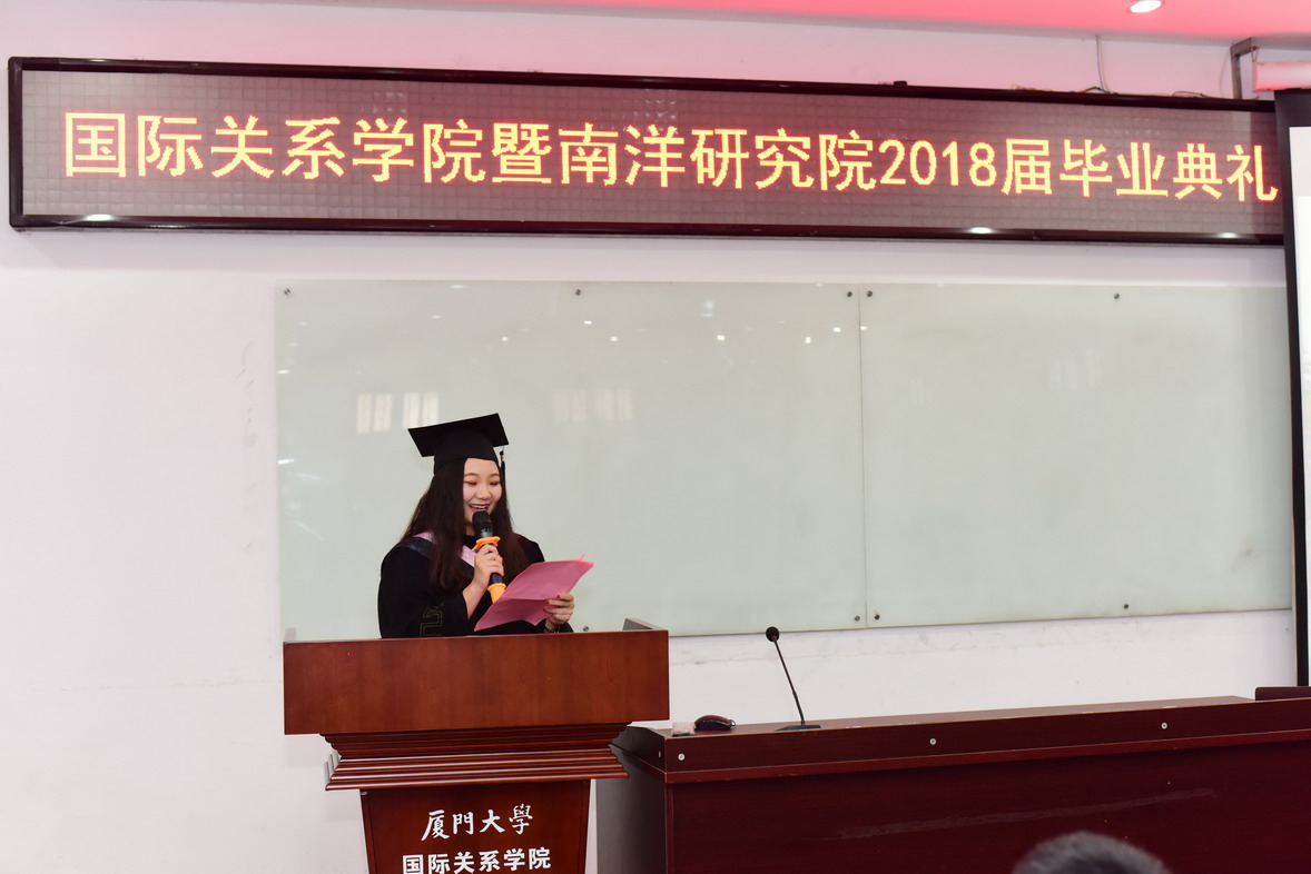 奏唱国歌后,国际关系学院/南洋研究院院长李一平首先致辞,他对18届的毕业生同学表达了殷切的期望。他强调当今的国际局势错综复杂,充满着机遇和挑战,我们国际关系学院的学生应该不断提高自己的能力,毕业之后在更广阔的天地里各展其能。正是有了年轻一代的奋斗,每个人、每个家庭和我们的国家才充满希望,他相信在座的各位同学都会有光明而美好的前景。教师代表沈燕清老师随后发言,她希望同学们能把健康放在首位,同时选择能实现自我价值的事业,心中有爱,勇敢追爱,国际关系学院/南洋研究院永远是大家温暖的港湾。