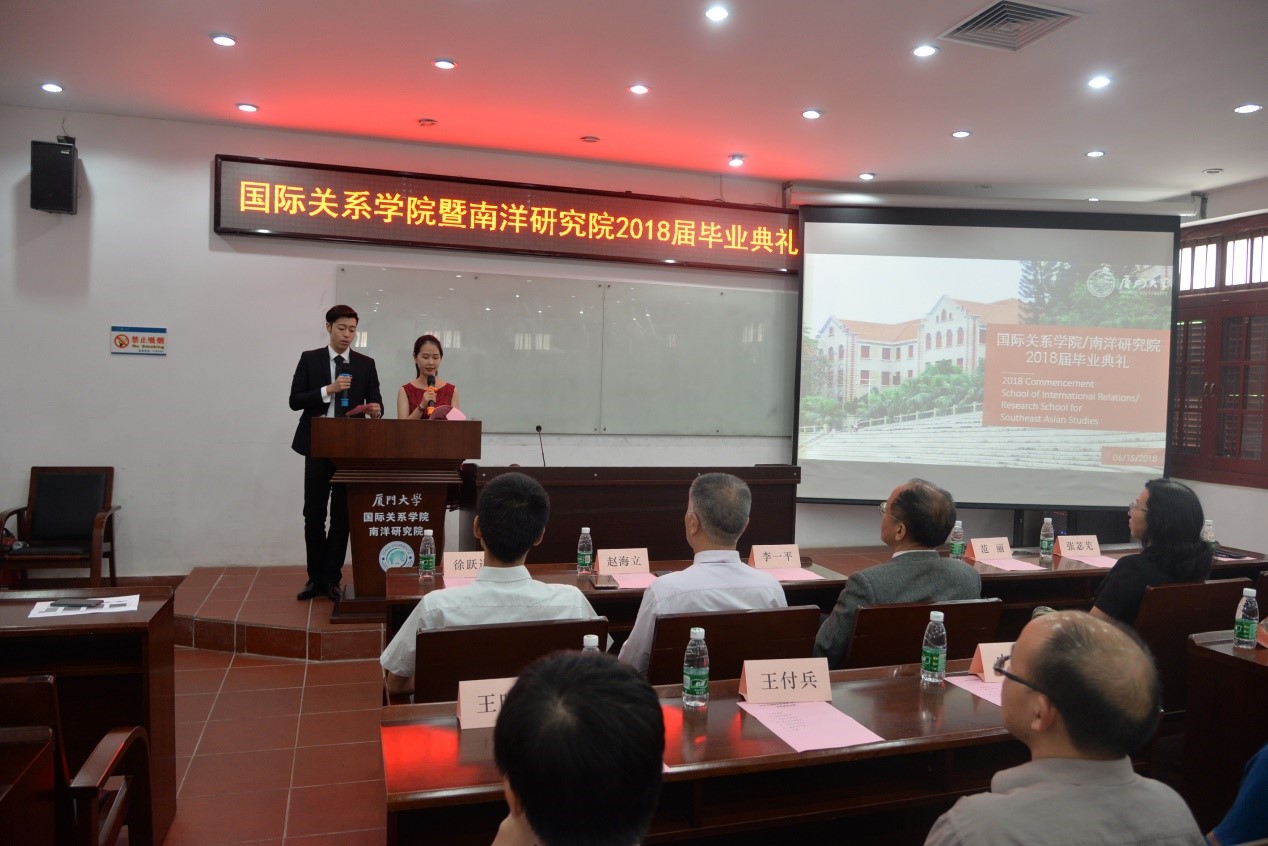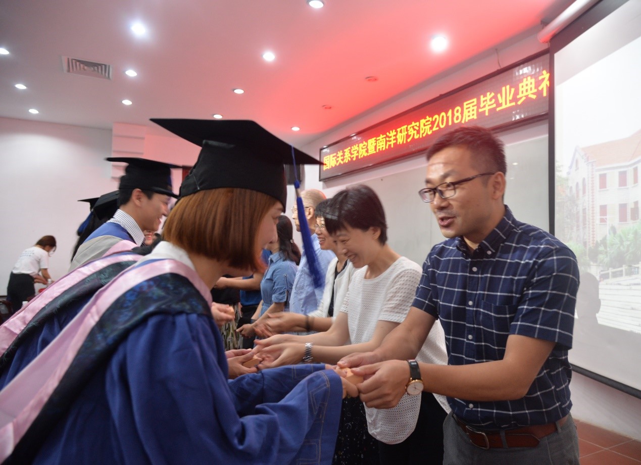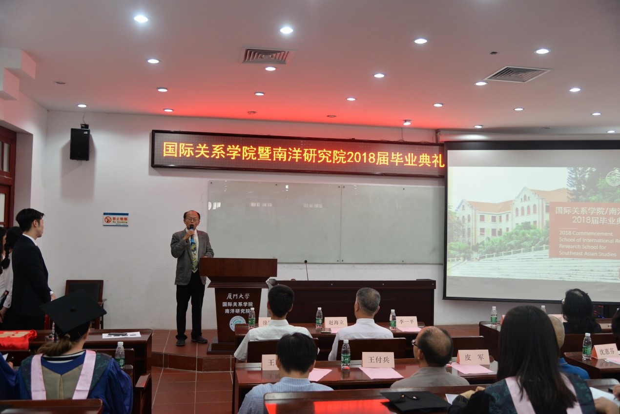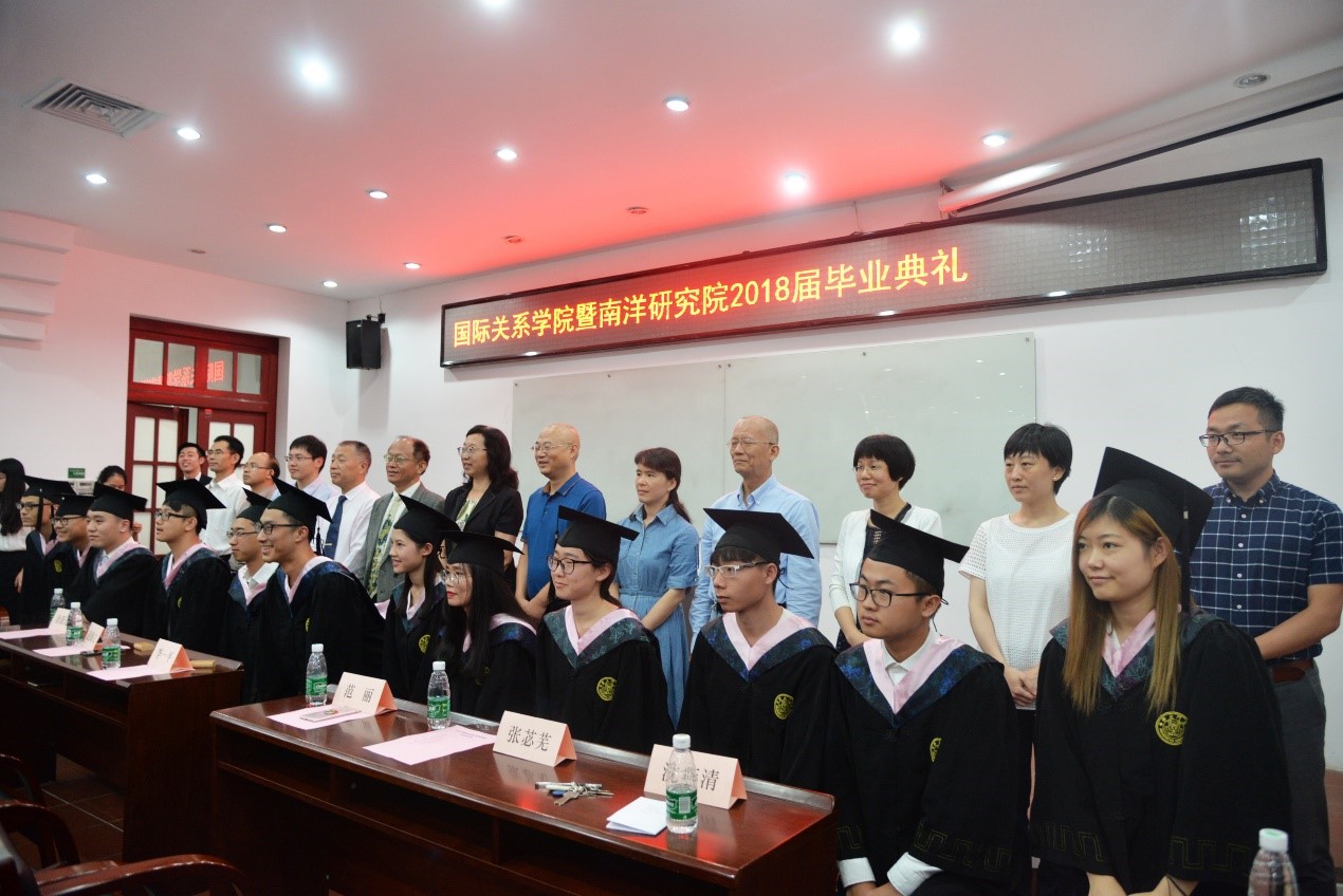 2018年6月15日下午,国际关系学院/南洋研究院2018届毕业生毕业典礼在南安楼101报告厅举行。出席毕业典礼的有院长李一平、院党委书记范丽、院党委副书记徐跃进、国际关系系主任赵海立老师、亚太国际关系研究所所长张苾芜老师、沈燕清老师、王付兵老师、沈惠芬老师、皮军老师、刘计峰老师、闫森老师、王昭晖老师、沈丽秀老师和郭晓玲老师。