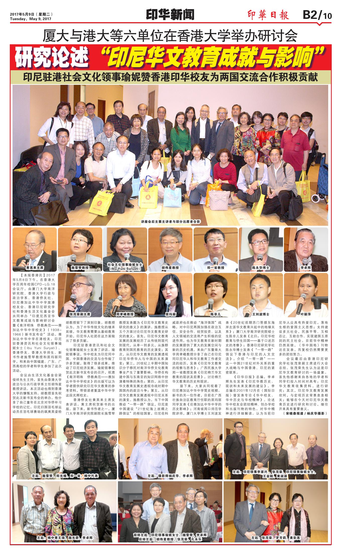 2017年5月8日下午,在香港大学百周年校园CPD-LG.18会议厅,由厦门大学南洋研究院、香港大学行政与政治学系、香港侨友社、印尼雅加达中华中学旅港校友会、香港印尼研究学社和香港生活文化基金会共同举办“印度尼西亚华文教育成就与影响研讨会暨《南洋明珠 侨教典范——雅加达中华中学校史》(1938-1966)新书发布会”活动。雅加达中华中学在港校友,印尼驻香港资讯和社会文化领事瑜妮女士(Ibu Yuni Suryati)、香港侨友、香港大学师生、新书作者施雪琴教授和居玛丽同学,和来自中国福建、广东、广西高校的学者和学生参加了这次活动。