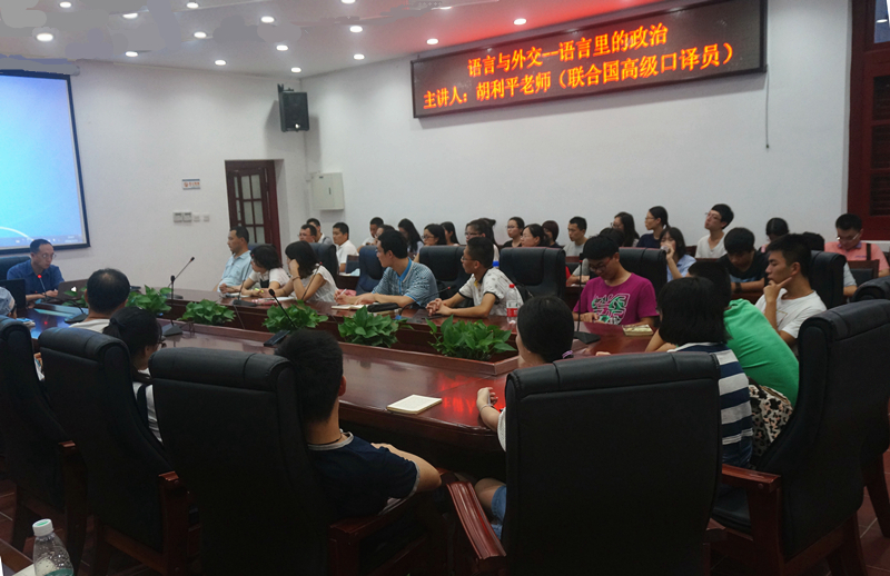 2016年7月15日19时,联合国高级口译员胡利平老师在厦门大学东南亚研究中心301(3)进行题为“语言与外交——语言里的政治”的讲座,本次讲座由厦门大学国际关系学院/南洋研究院张旭东副教授主持。