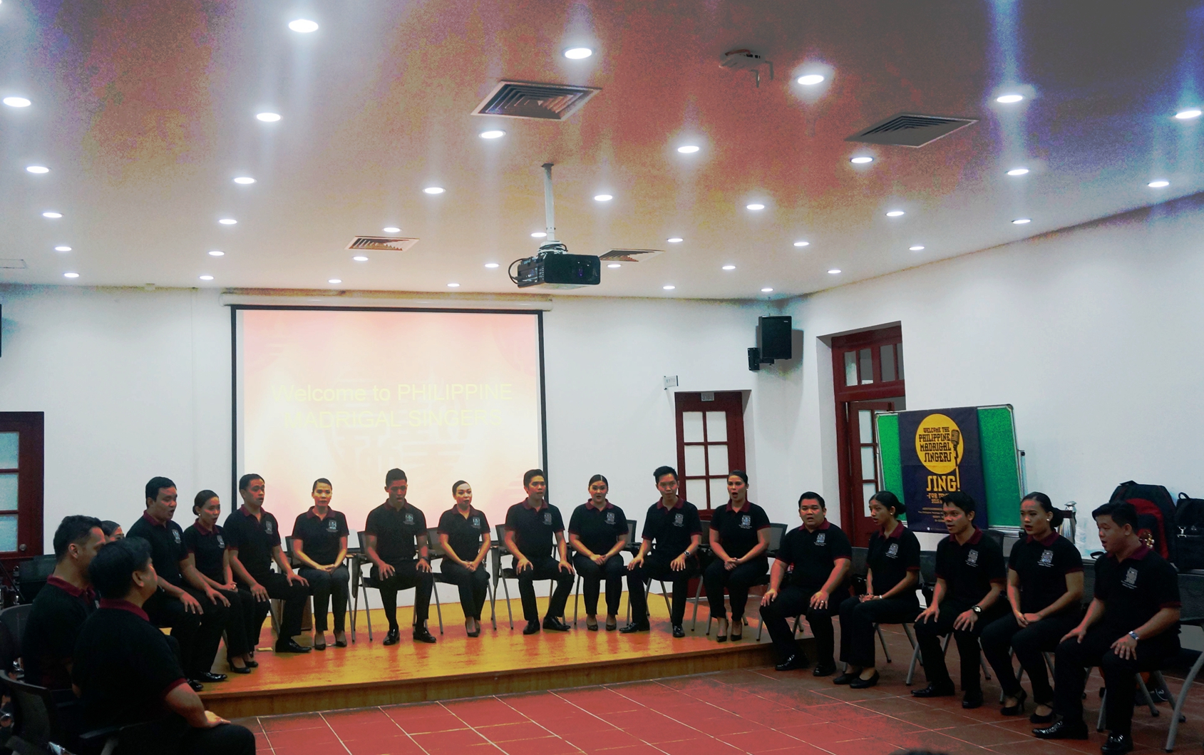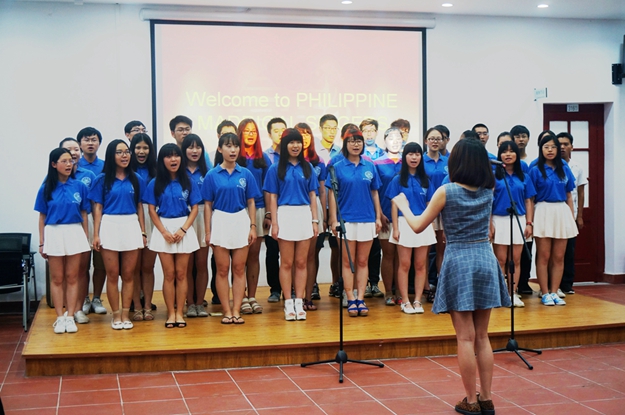厦门大学国际关系学院暨南洋研究院的张苾芜老师担任此次活动的主持。活动开场,他对Philippine Madrigal Singers的到来表示了热烈的欢迎。随后,国际关系学院全体2014级本科生登台演唱了《保卫黄河》和《歌唱祖国》两首曲目,赢得了在场观众热烈的掌声。接下来,菲律宾大学合唱团带来了几首菲律宾民歌、《marry you》、《coconut》等曲目,他们围成半圆围在一起,运用无配乐人声伴奏的特别的演奏方式,为观众们带来了视觉、听觉上的多重享受。最后厦大国关的学生向菲律宾大学合唱团赠送了小礼物,本次合唱交流活动在愉快欢乐的氛围中圆满结束。