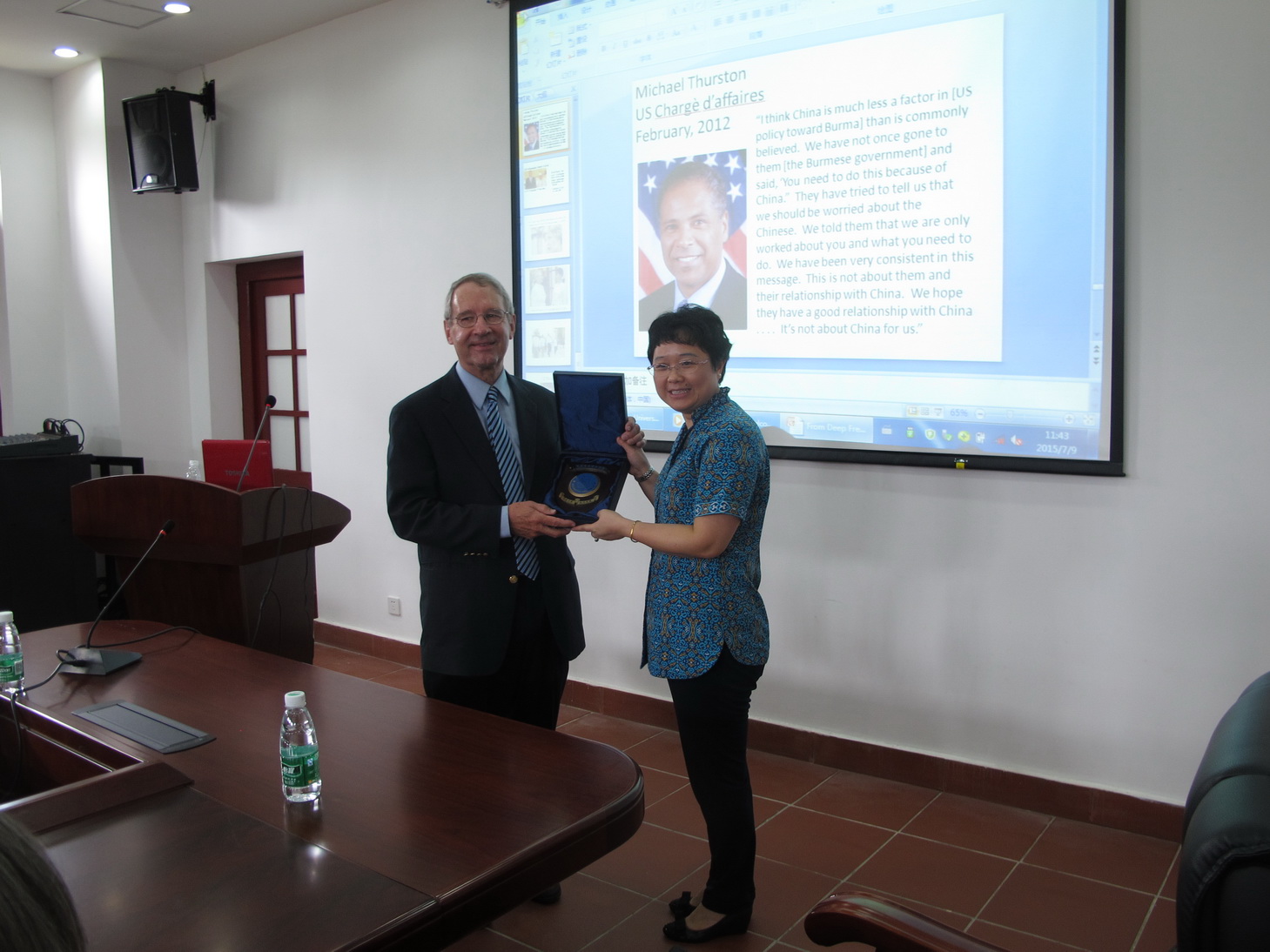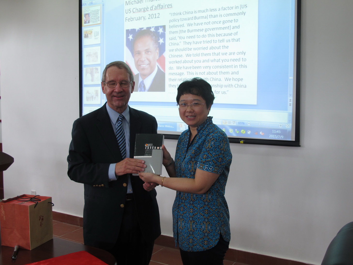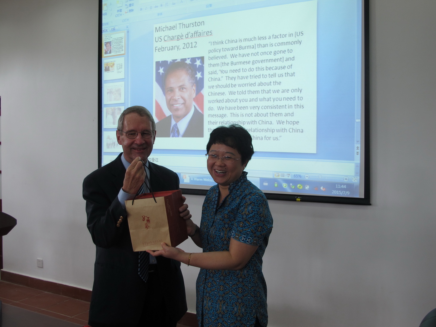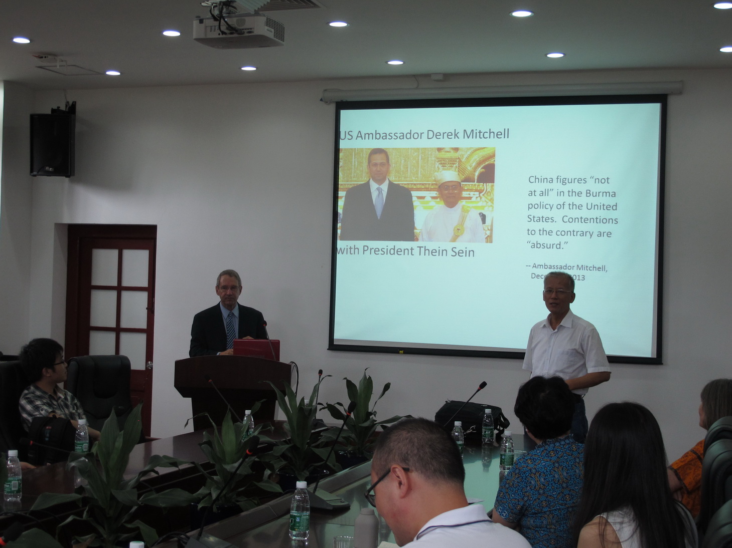 自2009年奥巴马政府开始,美国和缅甸的关系开始缓和并逐渐正常化。2011年3月,缅甸展开一系列政治和民主改革,并举行了国会补选,昂山素季及其领导的反对党全国民主联盟进入国会。这之后,美国等西方国家纷纷改变对缅甸的态度,2011年底,美国国务卿希拉里•克林顿访问缅甸,为两国恢复正式外交关系奠定基础。2012年7月,美国驻缅甸大使德里克•米切尔11号在缅甸首都内比都向缅甸总统吴登盛递交了国书,他由此成为22年来的第一位美国驻缅甸大使,这也标志着美国与缅甸正式恢复了大使级外交关系。在介绍了美缅关系演变历程后,Kenton Clymer教授又分析介绍了中国和缅甸的贸易经济关系发展,认为中国和缅甸之间有着非常大的交往空间。