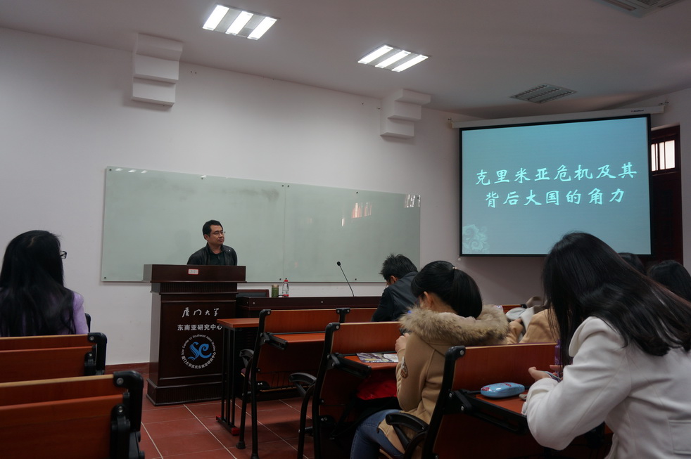 克里米亚地区历来是兵家的必争之地,近两年来乌克兰东部地区的动荡局势形成的克里米亚危机仍在持续,使这一地区成为世界关注的焦点。2015年3月13日上午,南洋名师讲堂活动在我院南安楼103教室如期举行,第一期活动由厦门大学国际关系学院暨南洋研究院冯立军副教授为师生们做了一场名为“克里米亚危机及其背后大国的角力”的讲座。本次讲座由厦门大学国际关系学院/南洋研究院研究生会主办。