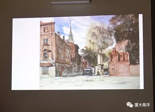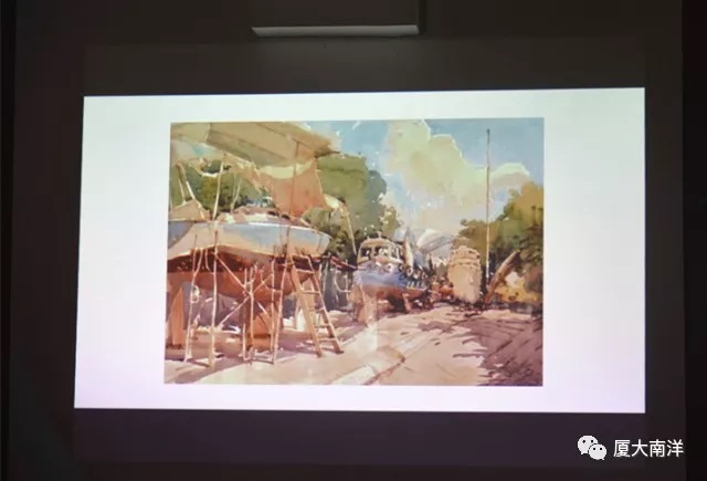 经典的作品总不过时。黄俊清老师接着展示了新加坡著名水彩画家陈长豪、王金成以及越南画家Minh Dam(闵丹)的代表作,并作了专业评析。黄老师认为艺术离不开节奏,一幅作品通过强弱色彩、远近虚实的节奏对比,方能表达画作的深层含义。如同陆俨少所说:“气象、笔墨、韵味,缺一不可。”黄老师还进一步与大家分享了西方经典的水彩画作,指出艺术鉴赏隐藏的规律。