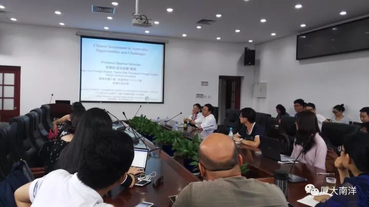 2017年10月20日上午十点,在厦门大学东南亚研究中心301(3)教室举办了由史蒂芬∙尼古拉斯教授主讲的以“中国在澳大利亚的投资”为主题的讲座,南洋研究院的师生对此次讲座的兴趣十分浓厚,出席人数多达56人,整个301(3)教室座无虚席。