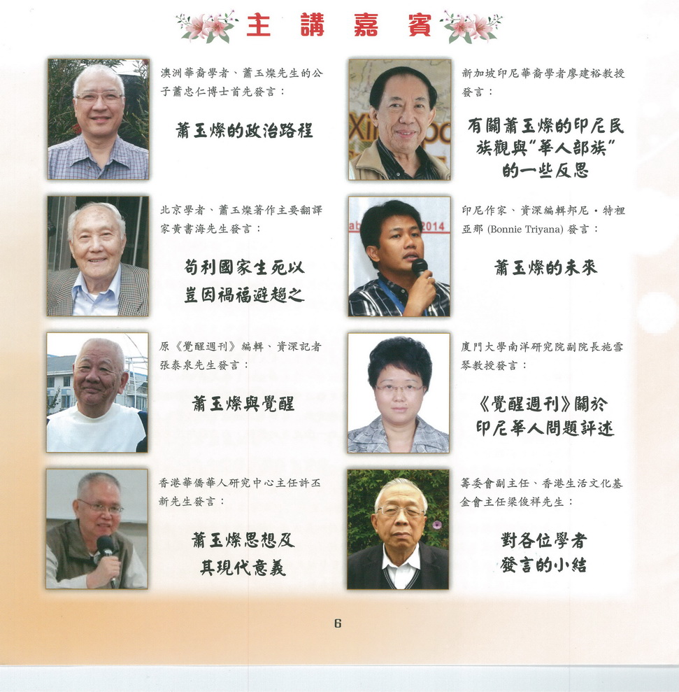 在下午的研讨会中,共有7位学者做了大会发言。首先,来自澳洲的萧忠仁博士简要地回顾了父亲一生为之不懈奋斗的事业,特别是萧玉灿为争取印度尼西亚各民族与华族的平等权益与自然融合之道所提出的理念和思想,他进一步阐明萧玉灿为印度尼西亚独立建国和民族建设留下的宝贵遗产值得后代继承。新加坡的华裔学者廖建裕教授则以大量的史料为基础向与会者重点介绍了他『有关萧玉灿的印度尼西亚民族观与“华人部族”的一些反思』;来自北京的印度尼西亚文翻译家、萧玉灿「五个时代」「殊途同归」等著作的主要译者黄书海先生以〝苟利国家生死以岂因祸福避趋之〞为题重点阐述了萧先生为印度尼西亚民族独立解放和民主建设奋斗一生及其所创立的伟大思想的意义,特别回顾了他在中国印度尼西亚两国签订《中国和印度尼西亚关于双重国籍问题的条约》过程中的重大贡献与独特的作用;而香港的张泰泉先生以“我与《觉醒》”为题向人们详述了萧玉灿生前创办的唯一一本印度尼西亚的中文时政周刊。来自厦门大学南洋研究院的副院长施雪琴教授发表了“《觉醒周刊》关于印度尼西亚华人问题评述”一文。该文以1958年的社论为基础,探讨了萧玉灿关于解决印尼华人政治经济文化问题的思想,支出萧玉灿先生在印尼华人问题上的远见卓识与深远历史影响。雅加达《史记》杂志(Historia)总编辑邦尼‧特里亚那先生(Bonnie Triyana)在他的“萧玉灿的未来”主题发言中,热情畅想了萧玉灿思想的未来前景与影响。最后,印度尼西亚归侨,香港华侨华人研究中心主任许丕新先生作了题为〝萧玉灿思想及其现代意义〞的发言,在学习和了解了他从小就十分崇敬的“萧伯伯”的思想和印度尼西亚社会前后半个多世纪的伟大变化后,从内心发出了一句深深的感慨,他高度赞扬萧玉灿思想的价值,认为“在洞察研究华人的历史走向和历史命运上,他比起我们许多人的眼光早看60年”。