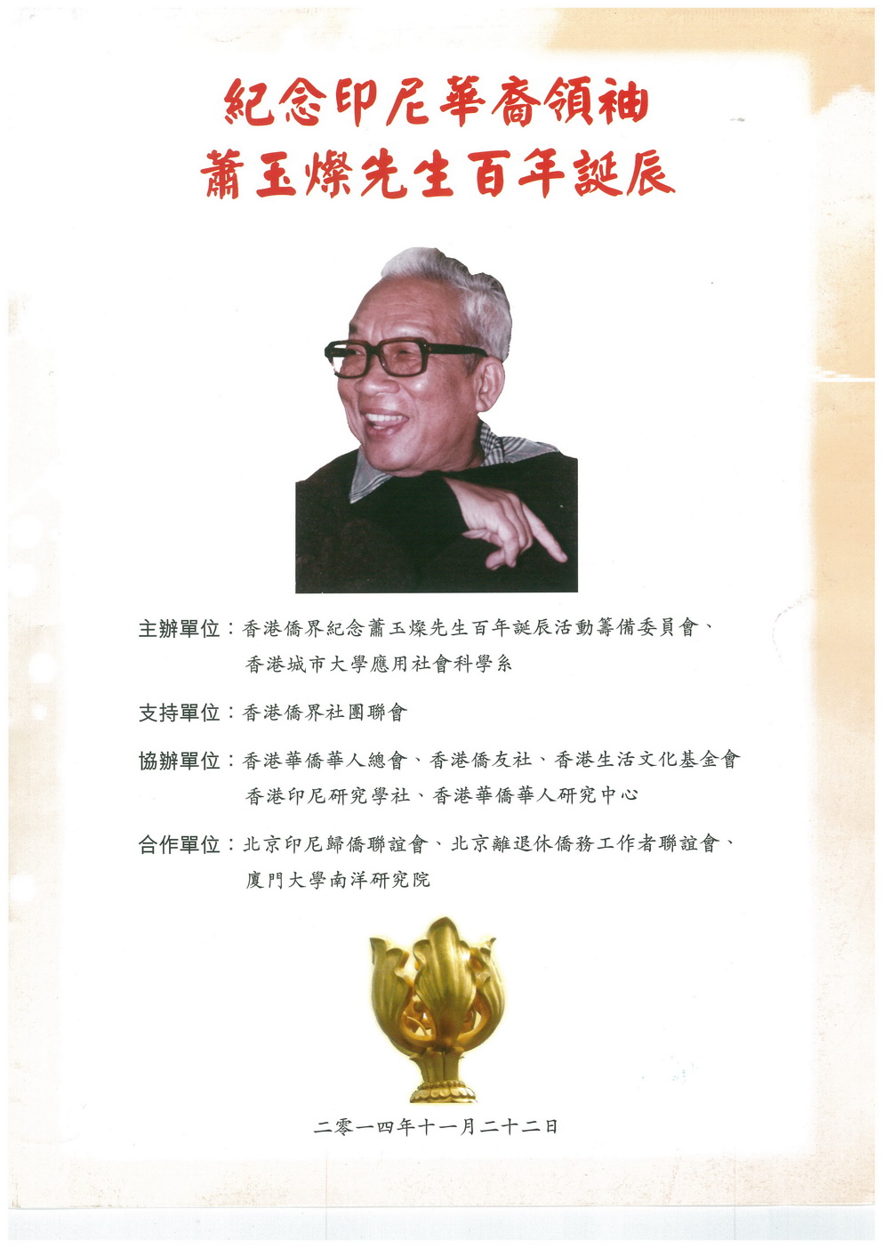 今年(2014)是印度尼西亚华族领袖、著名国务活动家、政论思想家萧玉灿先生诞辰百年的日子。由香港侨界社团联会香港城市大学应用社会科学系主办,厦门大学南洋研究院参与合办的纪念印尼华裔领袖萧玉灿先生百年诞辰研讨会于2014年11月22日下午在香港城市大学一号学术楼5号演讲厅成功举办。此次活动是印尼侨界在雅加达(3月)、北京纪念活动(10月)后的又一次大型纪念活动。来自印度尼西亚、澳洲、新加坡、北京、广州、厦门和香港的专家学者、侨界代表、原印度尼西亚共和大学的校友和萧玉灿先生的子女以及印度尼西亚驻港总领事Chalief Akbar先生等200余人参与了这一盛事。我院副院长施雪琴教授以及我院研究生Mina Murniasari, ArdhityaEduardYeremia, Basuk、赵琪锋同学也应邀参会。