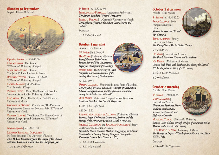 2013年9月28日至10月6日,我院聂德宁教授应邀前往意大利,出席由意大利那不勒斯东方大学主办的“16-18世纪历史上的海洋东亚,史料、档案、研究者:成果与展望”(Maritime East Asia in the Light of History, 16th– 18th Centuries,Sources, archives, Researcher: Present Results & Perspectives)国际学术研讨会。该国际研讨会于2013年09月29日~10月2日在意大利那不勒斯普罗奇达岛举行,协办的科研机构有:日本东京大学亚洲研究所、意大利罗马日本文化研究所、中国厦门大学南洋研究院、中国澳门大学社会科学学院。来自意大利那不勒斯、罗马、米兰,以及法国、荷兰、西班牙、美国、加拿大、日本、中国大陆、中国澳门的专家学者30余人出席参加了此次研讨会。