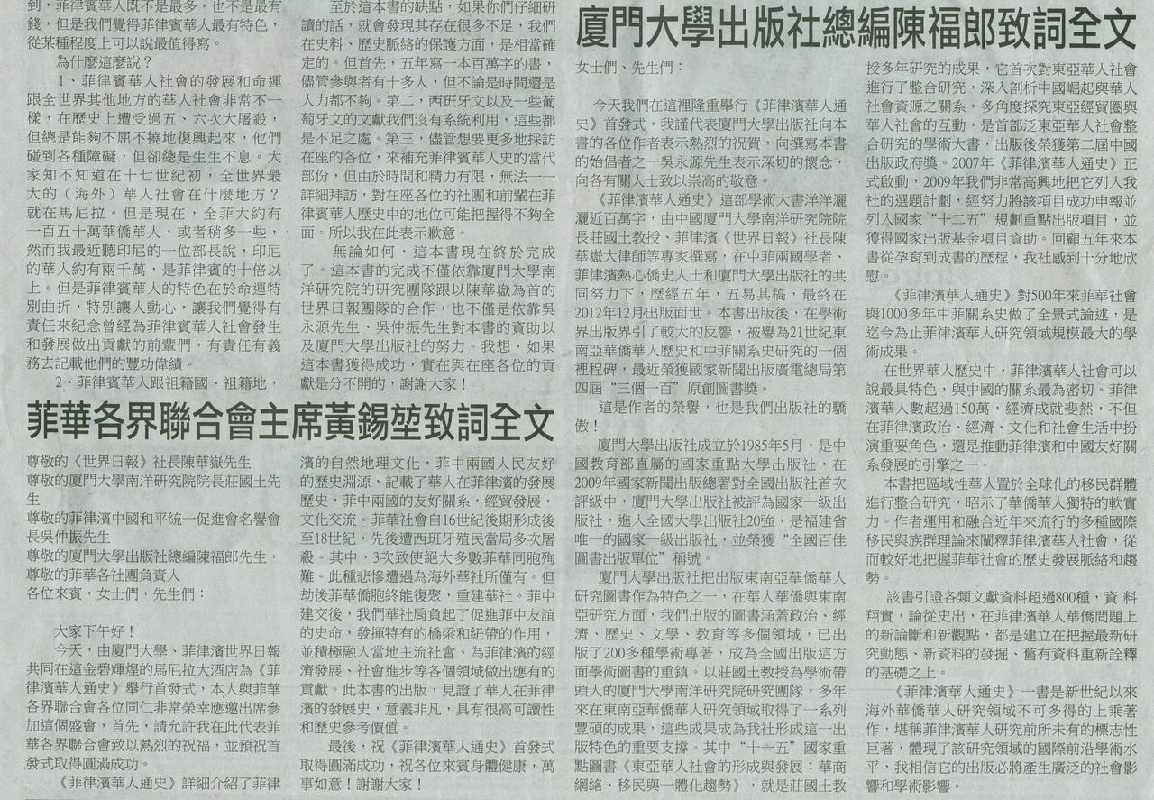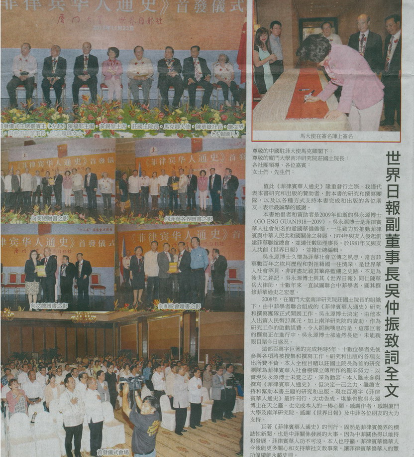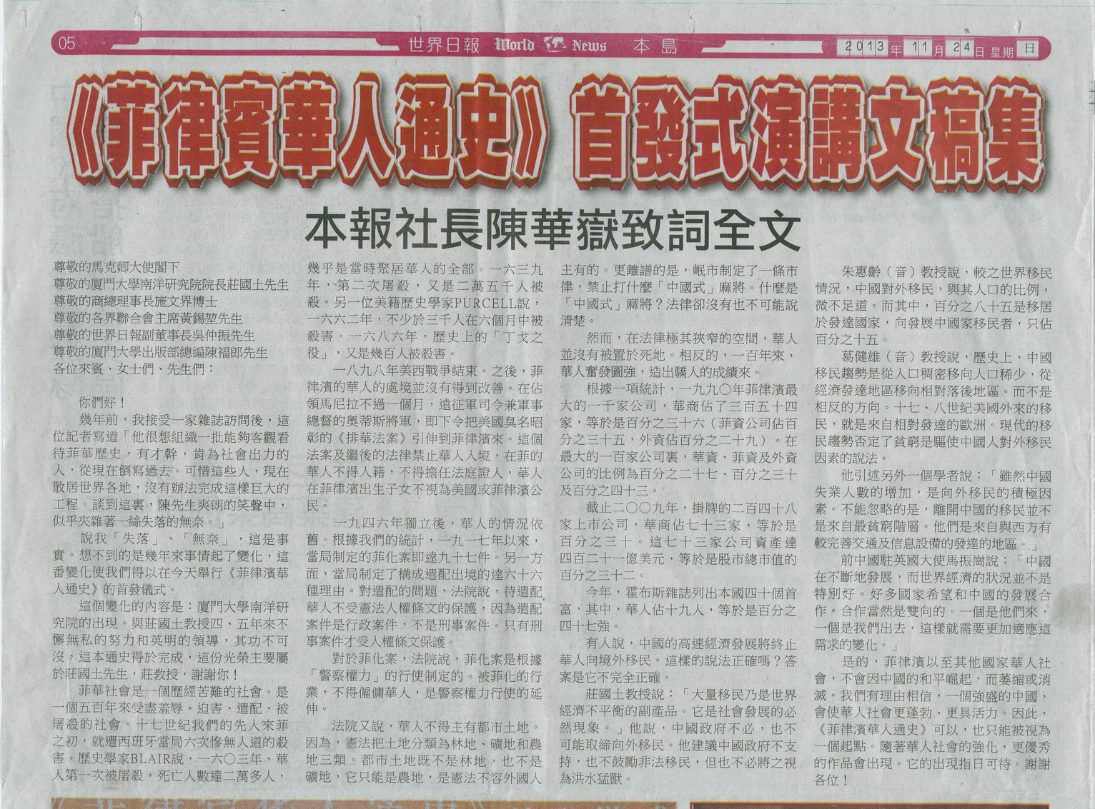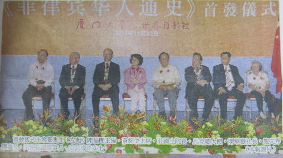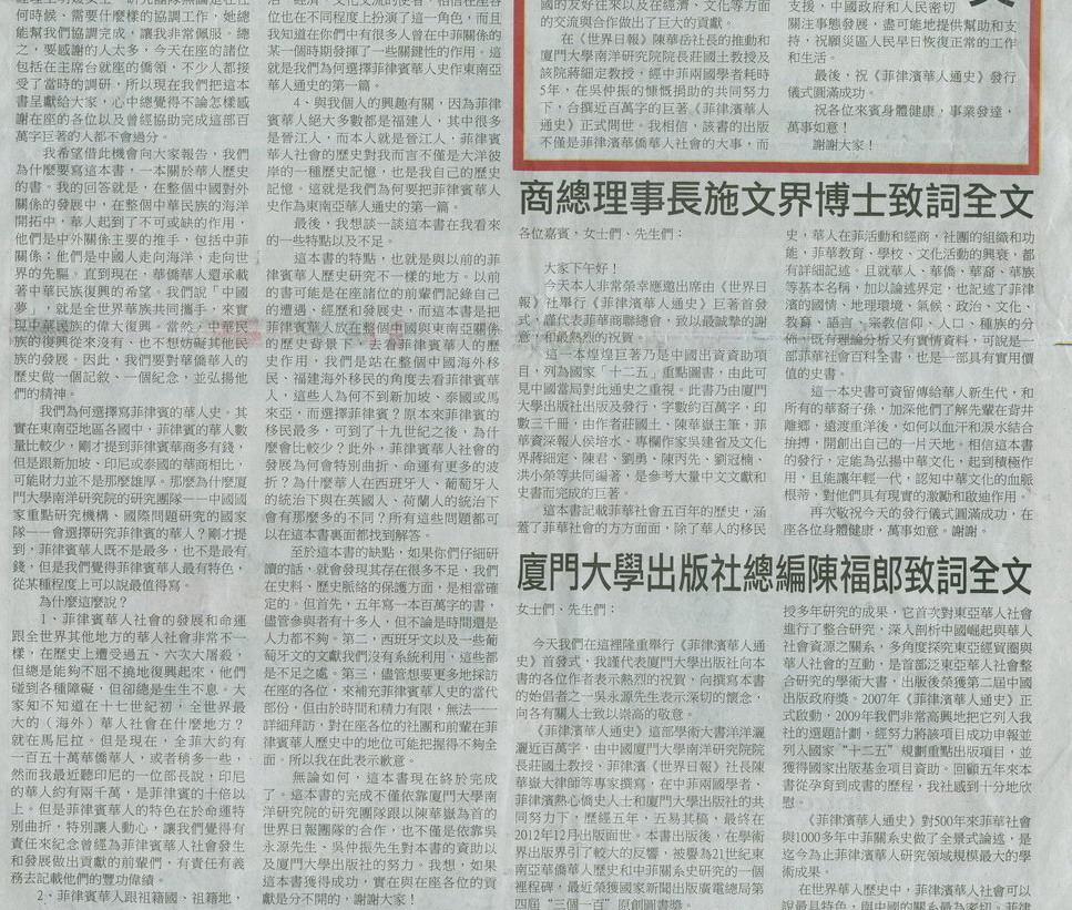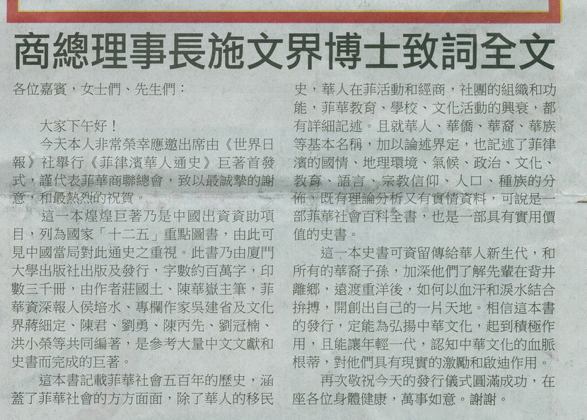 一直积极推动该书编纂的菲律宾《世界日报》社社长陈华岳在致辞时指出,菲华社会是一个历经苦难的社会,但华人奋发图强,创造出骄人成绩。他举例说,2009年一项统计显示,当年菲律宾上市公司共有248家上市公司,华商占到73家,华商上市公司总资产达424亿美元,占菲律宾股市总市值32%。而今年10月份,美国福布斯杂志列出菲律宾全国40位首富,其中有19人是华人富豪。