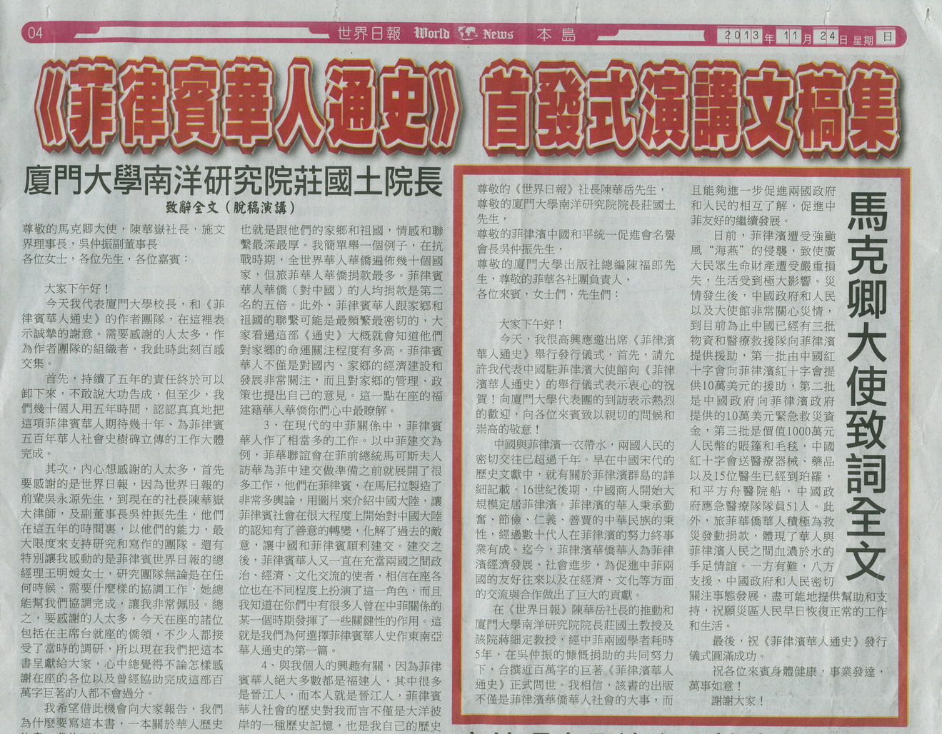 《菲律宾华人通史》是由菲律宾《世界日报》社与厦门大学南洋研究院联手历时5年编纂,中菲两国的学者、报人参与写作,全书约百万字,详细记述了菲律宾华人社会500年来的发展、变迁。