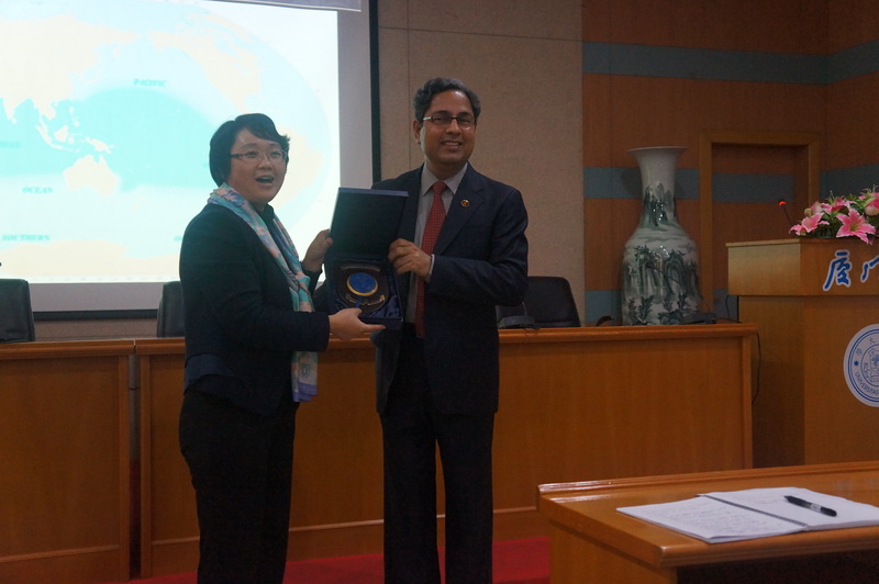 辛格教授为在场近一百名师生带来了近一个小时的陈述和展示,同学们获益匪浅并积极提问。半个多小时的提问环节结束后,辛格教授提到希望能与厦大师生有更多的交流机会,并对厦门大学国际关系学院/南洋研究院广大师生的支持表示感谢。讲座结束后,南洋研究院副院长施雪琴老师为斯瓦兰·辛格教授颁发了“南强学术讲座”纪念章并与之合影留念。