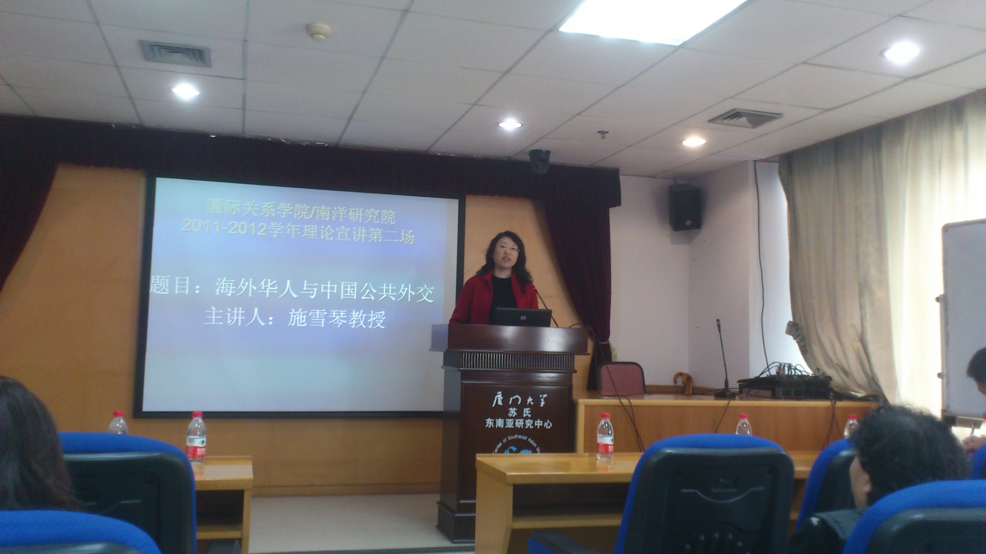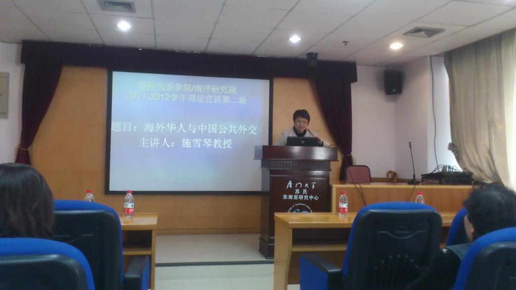 施雪琴教授主讲了题为《海外华人与中国公共外交》的讲座。她从近年来中国学术界与有关政府部门开展的一些活动引出了公共外交这个热点问题,介绍了公共外交产生的历史以及各国公共外交策略,并重点介绍了海外华人与中国公共外交的关系,从历史回顾中指出了海外华人在中国公共外交活动中采取的主要方式及方法、特点和作用等。同时也提出了个人研究心得和思考。