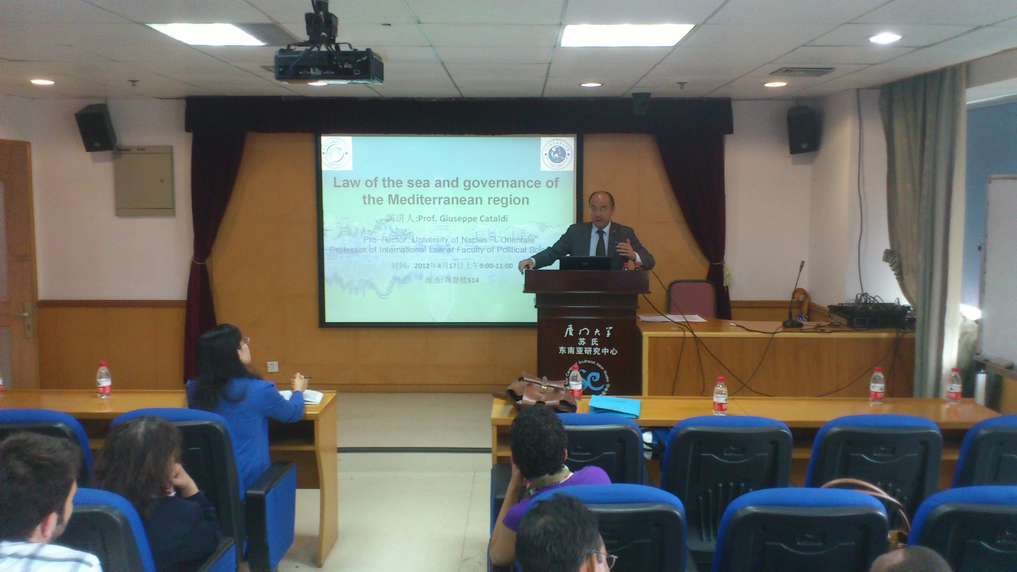 2012年4月17日上午9:00,那不勒斯东方大学副校长Giuseppe Cataldi教授在厦大颂恩楼514会议室作题为“海洋法与地中海海域的海洋管辖”(Law of the sea and governance of the Mediterranean region)的学术讲座,本院师生聆听了讲座。