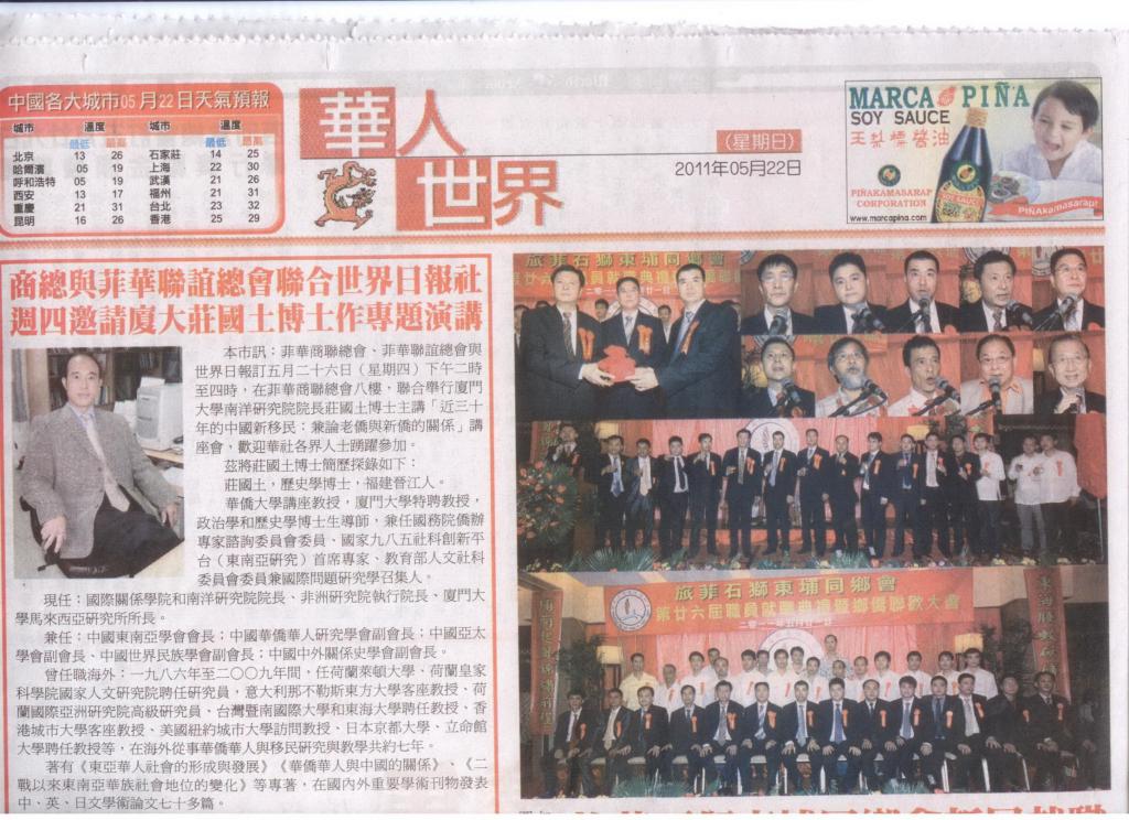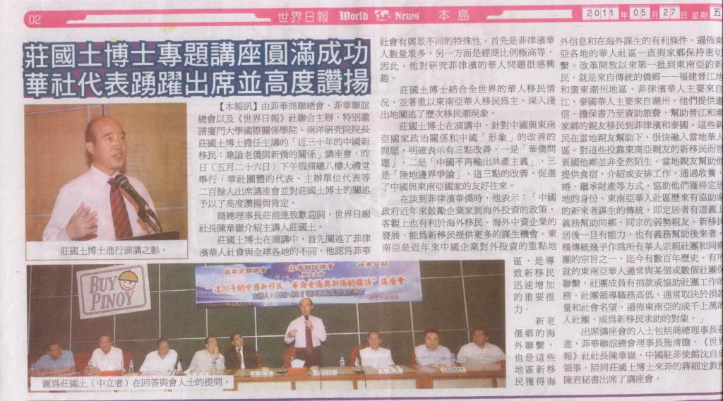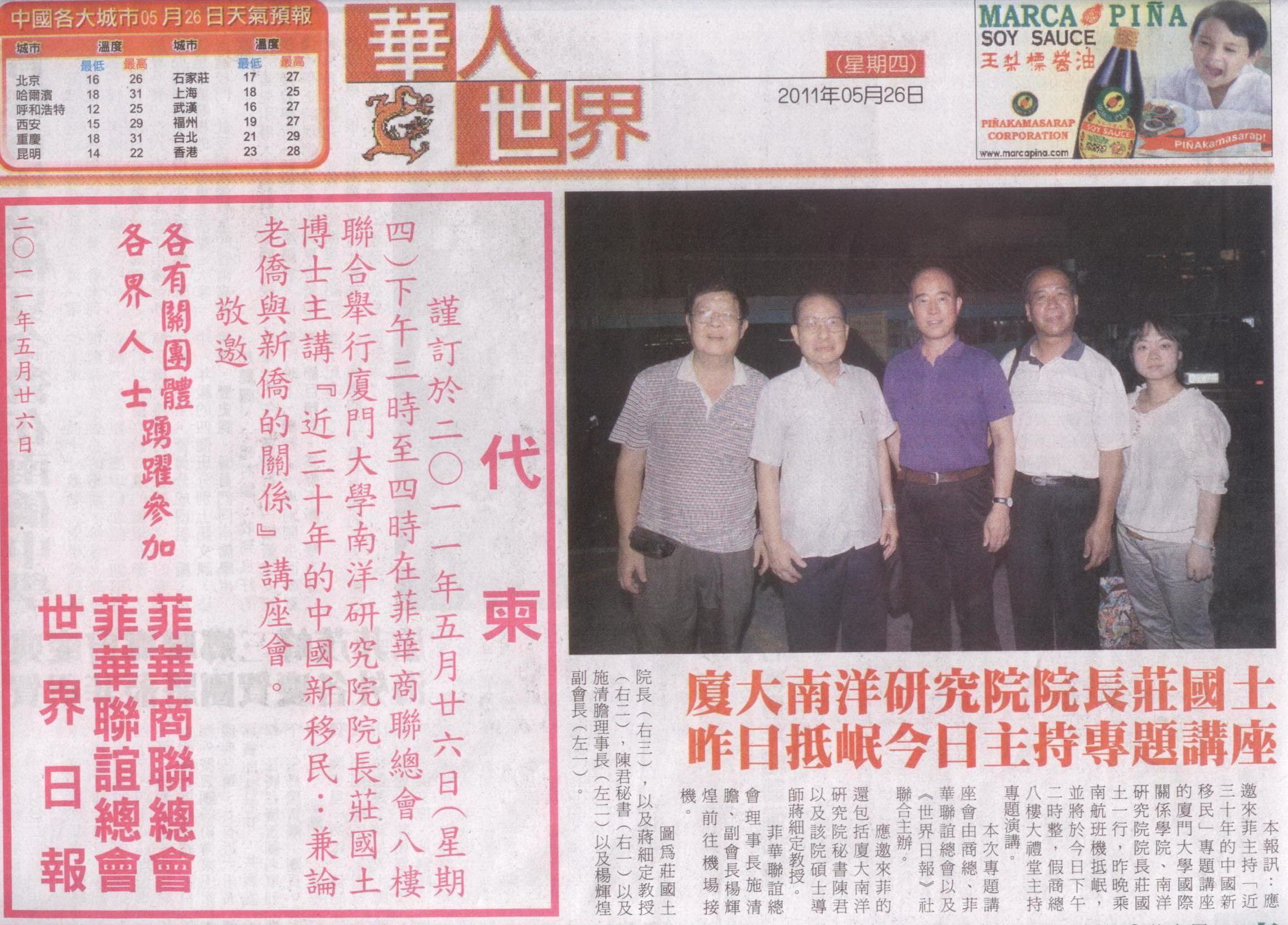 五月二十六日,菲华商联总会、菲华联谊总会与《世界日报》联合主办,特别邀请厦门大学国际关系学院/南洋研究院院长庄国土教授作专题演讲《近三十年的中国新移民:兼论老侨与新侨的关系》。商总理事长庄前进致欢迎词、世界日报社社长陈华岳主持,菲华联谊总会理事长施清胆、中国驻菲使馆沈自成总领事、以及华社团体的代表、主办单位代表等二百多人出席。