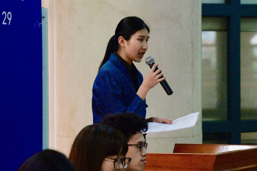 随后是模拟新闻发布会环节,由各国新闻官依次进行模拟新闻发言。各支队伍发言人用词准确、逻辑清晰,对会议谈判结果进行通报,沉着冷静地回答了与会代表和舆情观察团的提问。