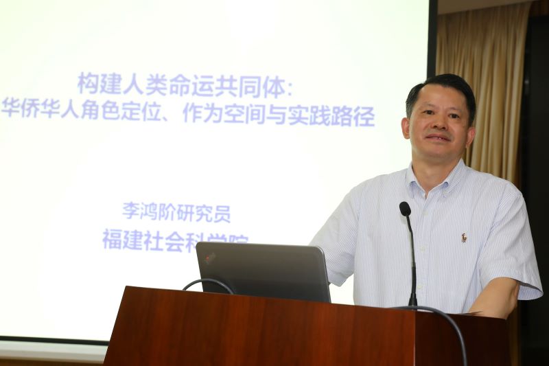 中国华侨历史学会副会长、福建省社会科学院副院长李鸿阶作了题为“构建人类命运共同体与海外华侨华人作用初探”的主旨演讲。李鸿阶认为,构建人类命运共同体是完善全球治理体系、促进世界繁荣发展的“中国方案”。海外华侨华人作为中国与世界沟通的“纽带桥梁”,是人类命运共同体身体力行的参与者,实实在在的受益者,构建人类命运共同体与海外华侨华人具有密切的联系。