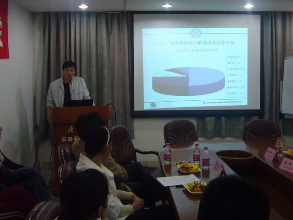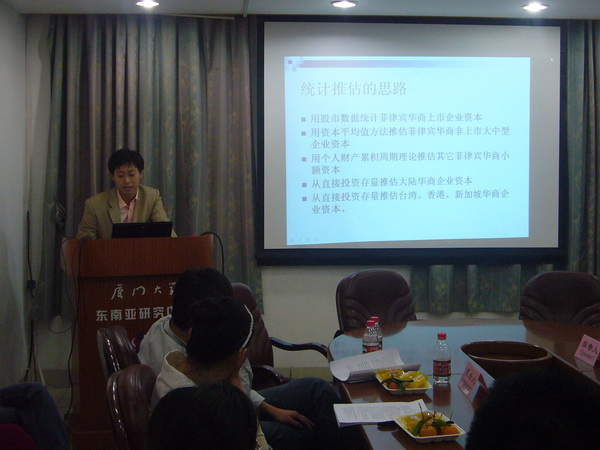 杨晓强同学首先作了“印度尼西亚的华商资本迷局”的主题发言,针对两个主题,即印尼华人的数量与印尼华人的资本两个方面介绍了自己的研究方法与理论观点,在比较中以全面翔实的资料和数据向在场观众详细介绍了自己对印尼华商总资本的考量,对华资在印尼社会中的比重和地位进行了分析总结。随后林联华同学就“美国华商现状”进行了发言。通过讲解,他不仅将自己的研究结果进行了全面真实的阐述,对美国华商的现状进行了定位,也将自己资料搜集与整理的方法和心得向在场观众进行了介绍。紧接着,王晓东同学以“菲律宾华商资本”为主题,用真实而准确的数据说明了菲律宾华商的影响力与定位。原晶晶同学通过对非洲华商资本发展的分析,提出了非洲华商资本目前发展所存在的问题与障碍,是大家对非洲的华商资本发展有了比较深入的了解,尤其是其新颖的资料收集与整理方式赢得了在场观众的很大兴趣。最后,来自马来西亚的华人——何启才同学,充分运用自己在地理环境上的优势,向大家介绍了马来西亚华商的发展状况。