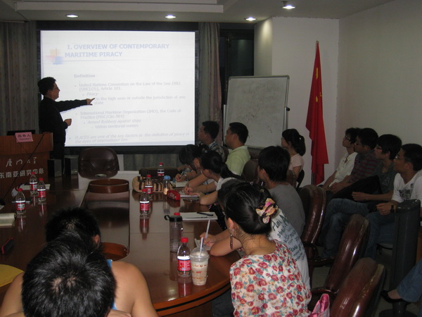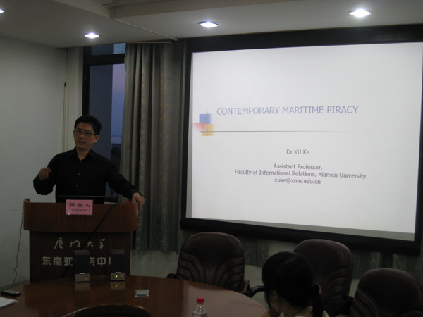 5月20日晚7:00,由国际关系学院/南洋研究院团委、研究生会主办,研究生会办公室、学习部联合承办的国际关系学院/南洋研究院学术讲座系列之当代海盗研究在颂恩楼1036会议室顺利举行。本次讲座由海盗问题研究专家——许可老师主讲,来自各院系近50名同学聆听了讲座。