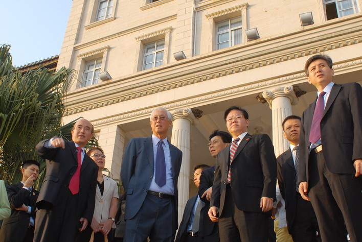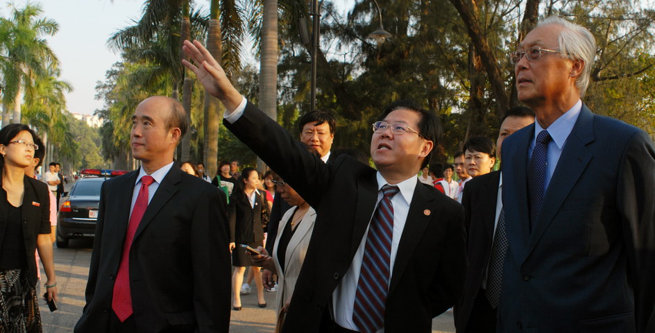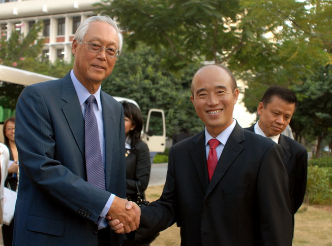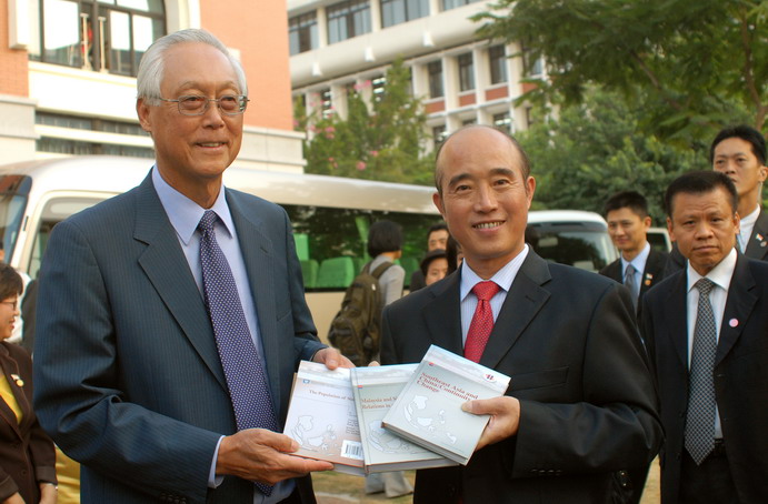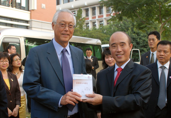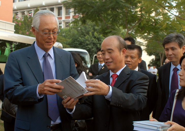 新加坡国务资政、前总理吴作栋先生率新加坡政府、企业和媒体代表团一行57人,于10月26日下午访问厦门大学。厦门大学校长朱崇实、东南亚研究中心顾问/南洋研究院院长庄国土教授等为客人介绍厦门大学及其与新加坡的历史和当前的关系。东南亚研究中心学生向吴作栋国务资政献花。庄国土院长向吴作栋国务资政赠送南洋研究院出版的著作《新加坡人口研究》(译著)、Malaysia and Sino-Malaysian Relations in a Changing World、Southeast Asia and China: Continuity and Change.这些著作体现了厦门大学与新加坡大学卓有成效的学术合作关系。