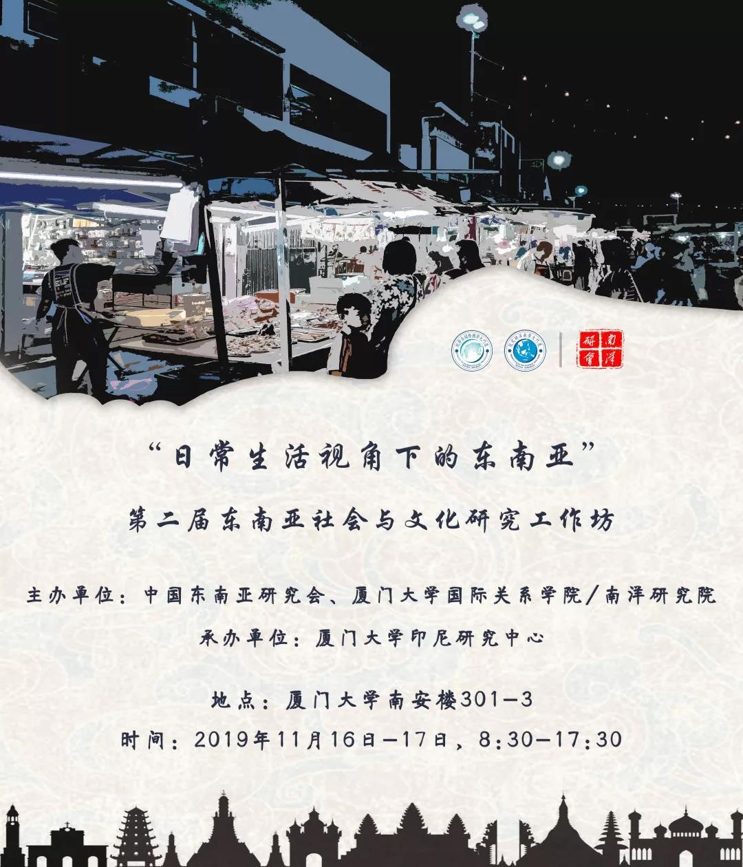 2019年11月16日-17日,第二届“东南亚社会与文化研究”工作坊在我院301(3)教室举行。本届工作坊由中国东南亚研究会与厦门大学国际关系学院/南洋研究院主办,厦门大学印尼研究中心承办,主题是“日常生活视角下的东南亚”,旨在从日常生活的视角出发,探讨融入行动者生命体验的东南亚社会与文化。参会者主要为人类学、社会学、历史学、政治学、文化研究及区域研究背景的青年学者,工作坊评议人多为当代东南亚、国际移民、东南亚华人、世界民族等领域的资深学者。工作坊围绕“网络、边界与流动”、“东南亚华人:生存策略与结构变迁”、“现代化、社会空间与转型”和“东南亚社会与文化研究:当下与未来”等四个单元展开,现场气氛热烈,掌声不断,获师生一致好评。