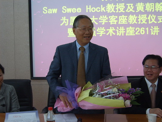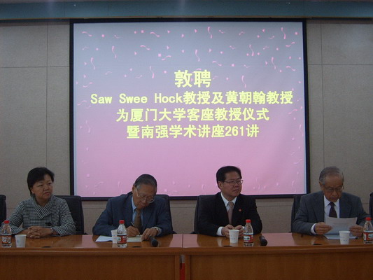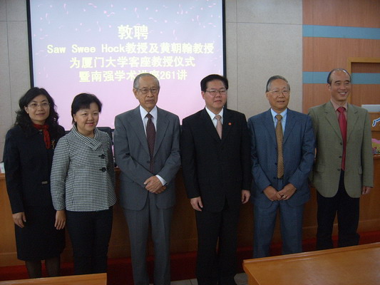 1月13日,新加坡东南亚研究所Saw Swee Hock(苏瑞福)教授和新加坡国立大学东亚研究所所长黄朝翰教授受聘为我校客座教授,我校校长朱崇实为两位教授颁发聘书,新加坡驻厦门总领馆总领事郑美乐出席敦聘仪式。校东南亚研究中心主任、南洋研究院院长庄国土主持仪式。
