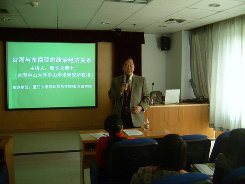 3月6日下午,台湾中山大学顾长永教授在东南亚研究中心副教授、南洋研究院副院长林梅的陪同下,在嘉三514会议室就“台湾与东南亚的政治经济关系”问题做了精彩的讲座。