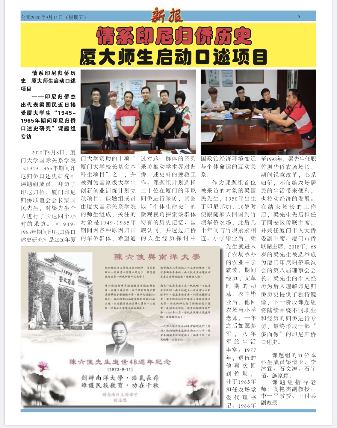 2020年9月8日,厦门大学东南亚研究中心高艳杰、李一平和王付兵老师联合指导的大创项目《1949-1965年期间印尼归侨口述史研究》正式启动并进行了首次访谈。课题组成员拜访了印尼归侨、厦门印尼归侨联谊会会长梁国民先生,对梁先生个人进行了长达四个小时的采访。《1949-1965年期间印尼归侨口述史研究》是2020年厦门大学资助的十项“厦门大学校长基金本科生项目”之一,并被列为国家级大学生创新创业训练计划立项项目。课题组成员由印尼研究中心多位老师共同指导,关注的对象是1949-1965年期间因各种原因归国的华侨群体,希望通过对这一群体的系列采访推动学术界对归侨口述史料的挽救工作。课题组计划选择约二十位在厦门的印尼归侨进行采访,试图以“个体生命史”的微观视角探索该群体特有的历史记忆、国族认同,并透过归侨的人生经历探讨中国政治经济环境变迁与个体命运的互动关系。印尼《新报》对此项活动做了报道。