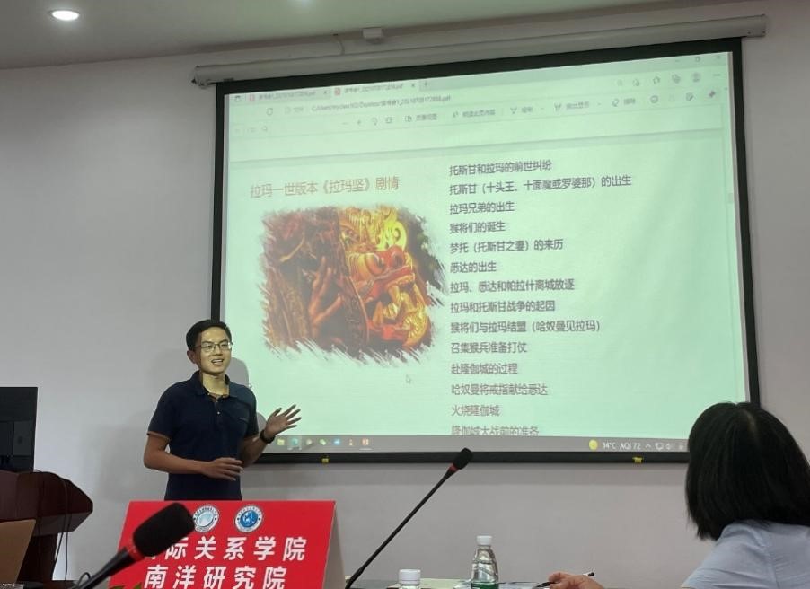 在问答互动环节,在座师生讨论热烈,问题涉及缅甸的性别平等、越南现代制造业、中国与东盟之间的文化软实力等内容。在回应部分,陈攻学长推荐了季羡林的《罗摩衍那初探》一书,他还分享了孔剧表演的视频,让大家对泰国传统舞剧的艺术特点“情节单一、以舞传意、造型独特”有了更为直观的感知。