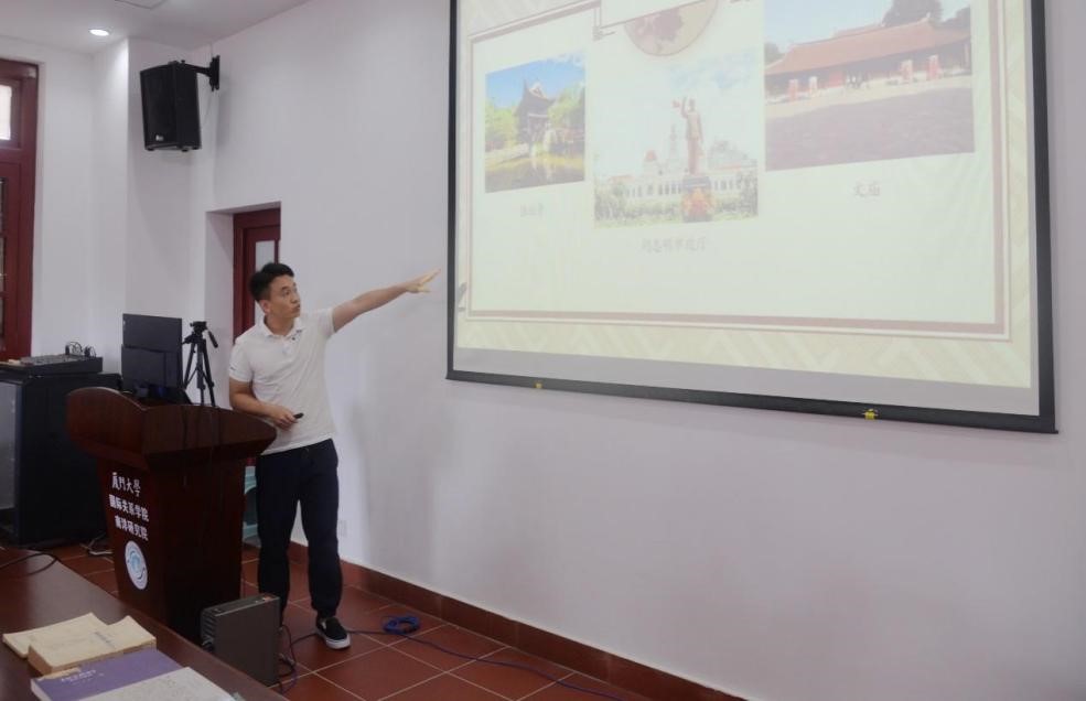 在讲座最后一部分,汤国琛学长带我们领略了一个不一样的越南。他从越南的饮食、建筑和服饰引入,娓娓而谈,展现了独特的越南风光。了解越南,从了解其文化和历史开始。东山文化是越南文化的源头,但越南文化同样受到汉文化、占婆国文化和西方文化的影响,具有多样性的特征,其中汉文化对越南文化影响最为深远。在越南文学发展的历程中,汉文化已经成为了越南文学中不可分割的一部分。越南文学随着越南文字的演变,主要经历了汉语文学、喃字文学和拉丁化越语文学三个阶段。越南著名诗人、文学家阮攸的《金云翘传》是喃字文学的代表作之一,作者改编了清朝时期青心才人的章回小说《金云翘传》,并重新创作一些故事情节,以越南特有的诗歌形式“六八诗体”写成。这部作品叙述了出身书香门第的王翠翘一生坎坷的生活遭遇,生动地演绎了一桩凄美的爱情故事,反映了封建时代许多有才能的人和社会现实相矛盾的现象,引起了越南人民的强烈共鸣。阮攸的《金云翘传》体现了越南文学的独有风貌,是中越两国文化紧密交织的杰作,也是两国文化紧密相连的一条纽带。这部作品是越南文学发展至顶峰时期的一部代表作,之后被译成多国文字,成为世界文学遗产。讲座最后,国琛学长还朗诵了一段“六八歌谣”,富有情感和韵律,颇具感染力。