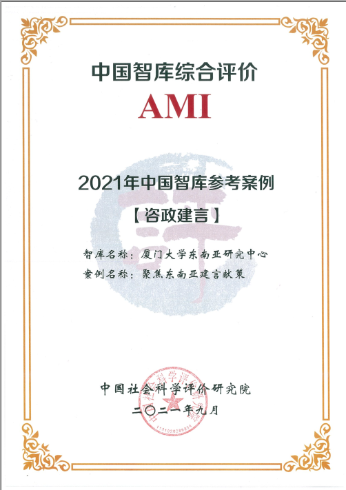 日前,中国社会科学评价研究院以四年为周期,以定性评价与定量评价相结合的方法,构建智库综合评价指标体系,组织开展了2021年中国智库综合评价。此次评估,有454家智库参与共提交621份《中国智库综合评价研究项目2021年智库特色指标申报书》,经过多轮专家评审,63份申报书入选参考案例。其中,厦门大学共有2家智库入选,系我院的东南亚研究中心和南海研究院。东南亚研究中心提交的特色案例是“聚焦东南亚建言献策”。