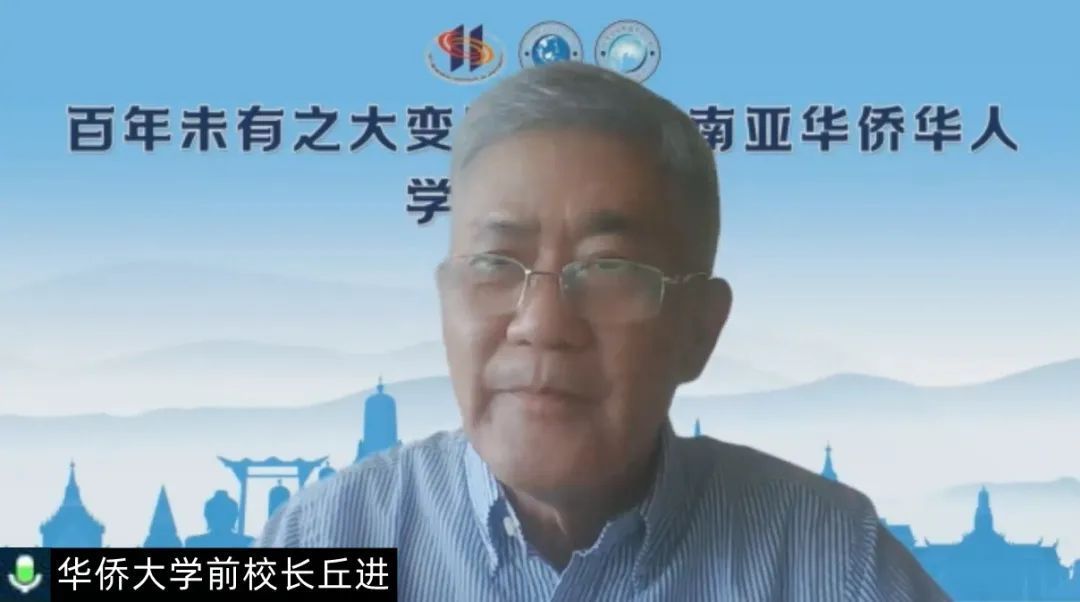 嘉宾代表致辞环节,华侨大学前校长丘进发表“对‘百年变局与东南亚华人华社’的几点思考”讲话。丘校长阐述了其对百年来未有之大变局的理解、从历史角度观察东南亚华社在传统和文化上的变化、华侨华人忠诚度等问题。他认为华侨华人研究更多的是一个学术领域,应该尽量让其回复本位,若从学术研究的角度反衬或照映到社会和政治上,或许能激发更多的活力或价值。