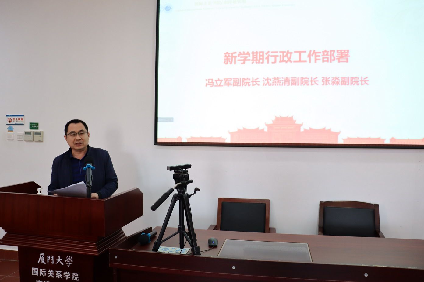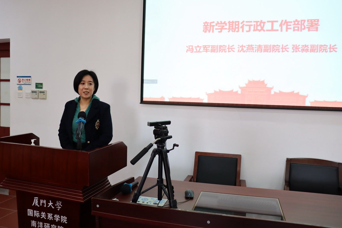 冯立军、沈燕清和张淼三位副院长分别就新学期行政工作进行部署。冯立军副院长部署本科教学评估、本科招生宣传、本科教学同行交流研讨等工作;沈燕清副院长部署筹办学术会议、举办学术讲座、申报课题、申报奖项等工作;张淼副院长部署调整研究生培养方案、提升研究生论文质量、加强对外交流和合作等工作。