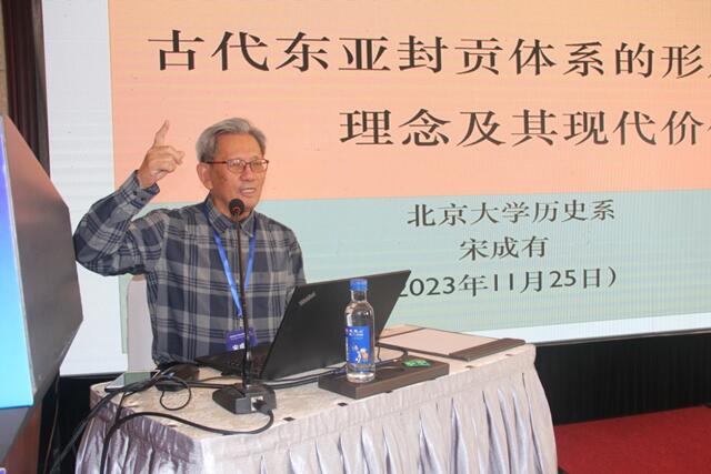 中国日本史学会常务副会长,北京大学韩国学研究中心副主任宋成有在主题发言中表示,古代东亚封贡体系的初建和发展可分为三个阶段,夏商周三代的初建,秦汉之际初步形成轮廓,以及魏晋南北朝时期的全面发展,突出了东亚封贡体系的中心分裂、胡族王权崛起、海东国家的多元化互动等特点。东亚封贡体系明确华夷之变、为政以德、怀柔远人和协和万邦等核心理念,不仅在当时推动了封贡体系的形成,而且对华夏民族和东亚国际社会的文化价值产生深远影响,形成了区分文化、政治传统和国际意识的体系。宋成有发言引发共鸣。他表示,在对古代东亚封贡体系的研究中,要关注中国特色和国际最新理论,实现两者的有机结合,为构建更为丰富的理论体系提供借鉴。