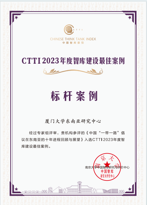 东南亚研究中心参评的《中国“一带一路”倡议在东南亚的十年进程回顾与展望》入选CTTI2023年度智库建设最佳案例,有关中国与东南亚关系的研究报告获得CTTI2023年智库研究优秀成果特等奖。