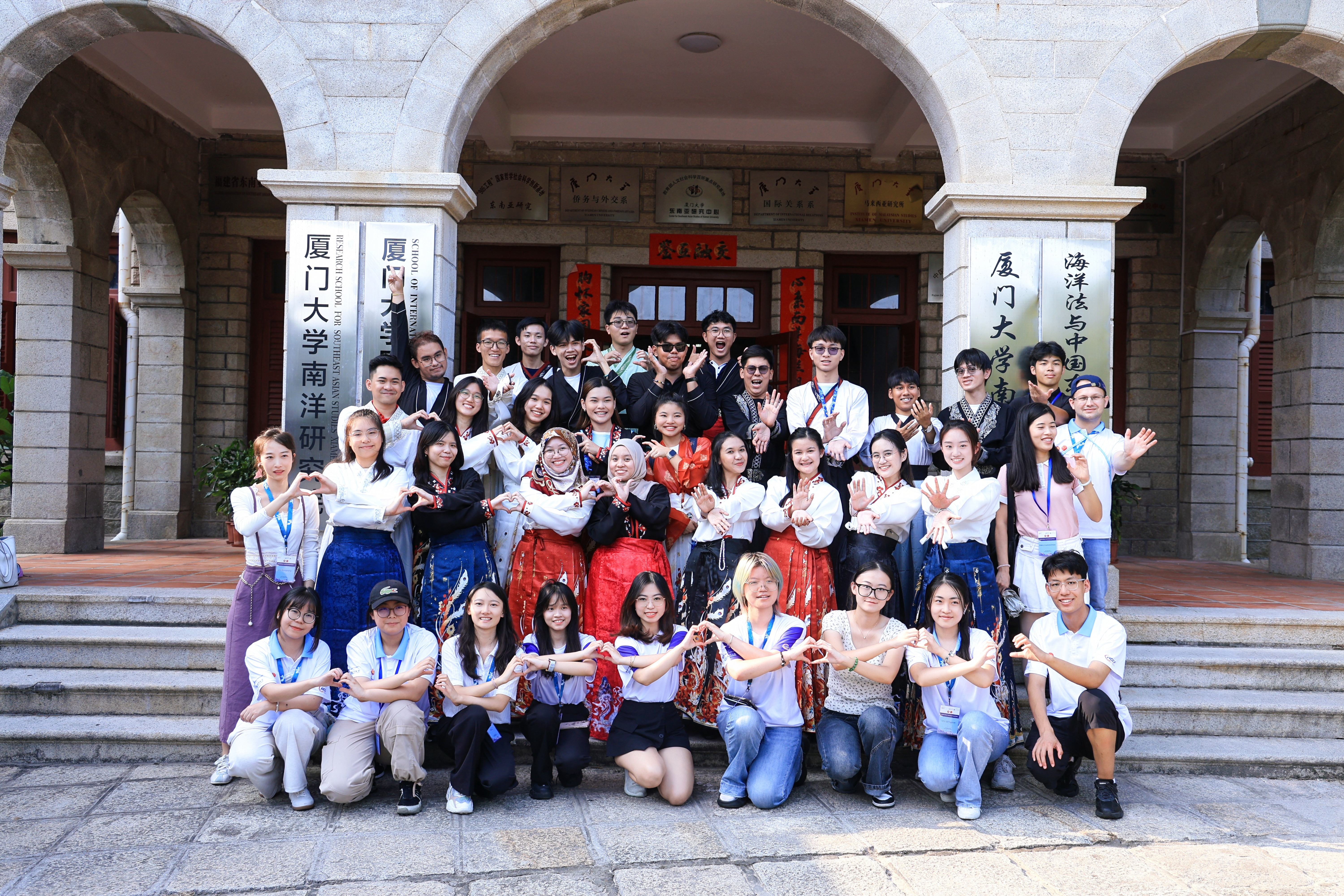 (交流营员身着汉服在厦门大学国际关系关系学院/南洋研究院院楼前合影)