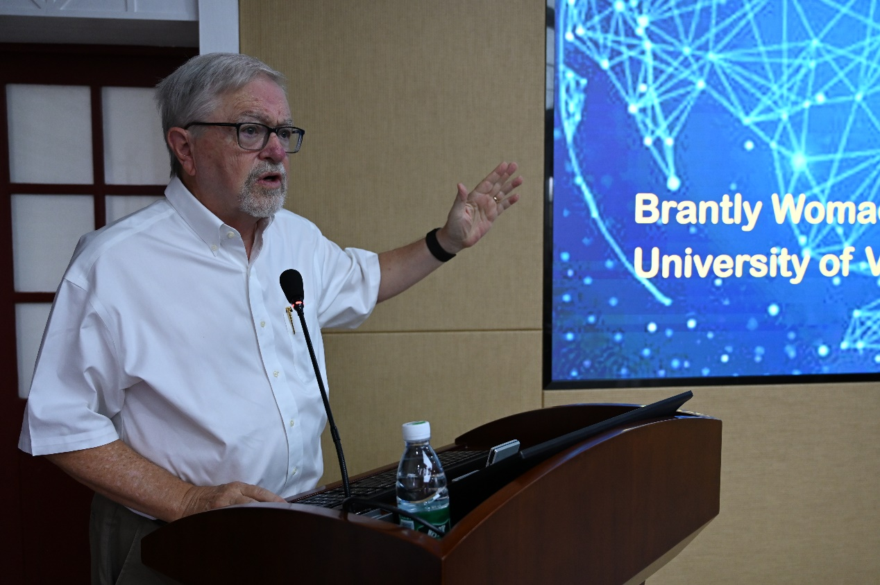 2024年9月23日下午,“观世界”系列讲座第一讲在厦门大学南安楼301-3会议室举行。本次讲座特邀布兰德利·沃马克教授为主讲人,主题为“重新定位亚太:地区中国与世界秩序”。布兰德利·沃马克教授是弗吉尼亚大学米勒中心高级研究员、政治系外交事务名誉教授。作为国际关系领域的著名学者,布兰德利·沃马克教授主要关注中国外交政策和中美关系,其研究常常深入探讨东亚地缘政治动态的复杂性以及影响当前政策的历史背景,强调从文化和历史角度理解国际互动的重要性。厦门大学国际关系学院/南洋研究院王昭晖副教授担任主持人。