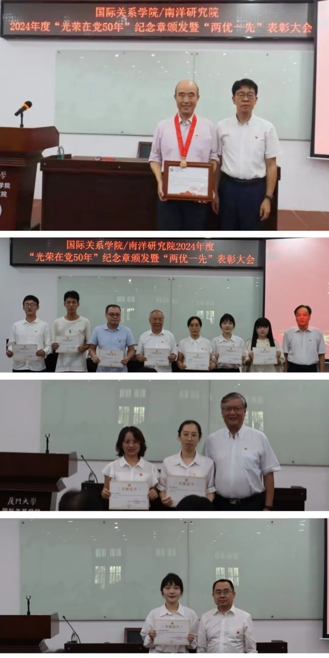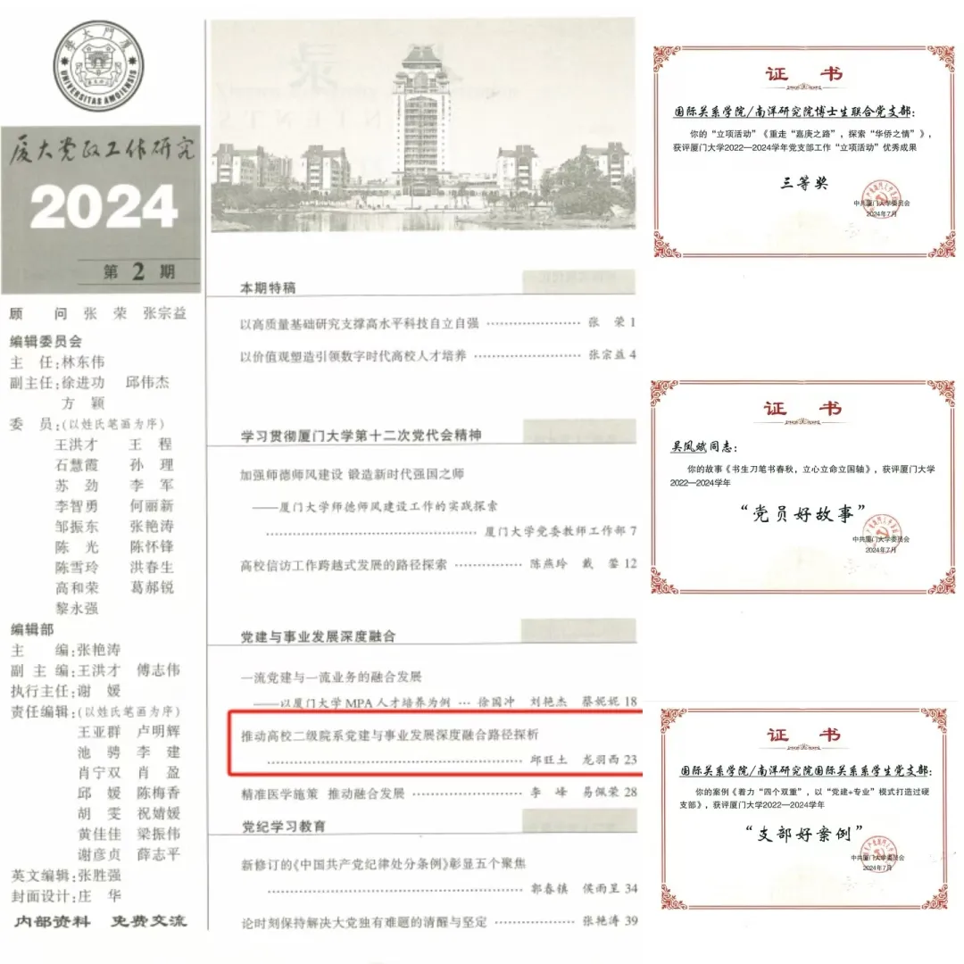 2024年,学院党建成果丰硕,3项成果获得“厦门大学2022—2024学年党支部工作”立项活动优秀成果和“党员好故事、书记好党课、支部好案例”表彰。以学院党委实践探索为素材撰写的理论文章参加“新时代高校党建与事业发展深度融合理论与实践研究”全国学术研讨会,并被《厦大党政工作研究》收录。