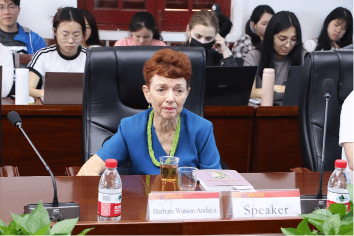 与谈人施雪琴老师对Andaya教授的发言作了回应与点评。在互动环节,与会老师和同学们就东南亚的独特性、历史上对中国的显著影响、中国东南亚研究的优势等问题先后提问,Andaya教授一一给予解答,现场讨论气氛热烈。最后,沈惠芬老师代表学院向Andaya教授表示感谢,本次讲座在热烈的掌声中圆满结束。