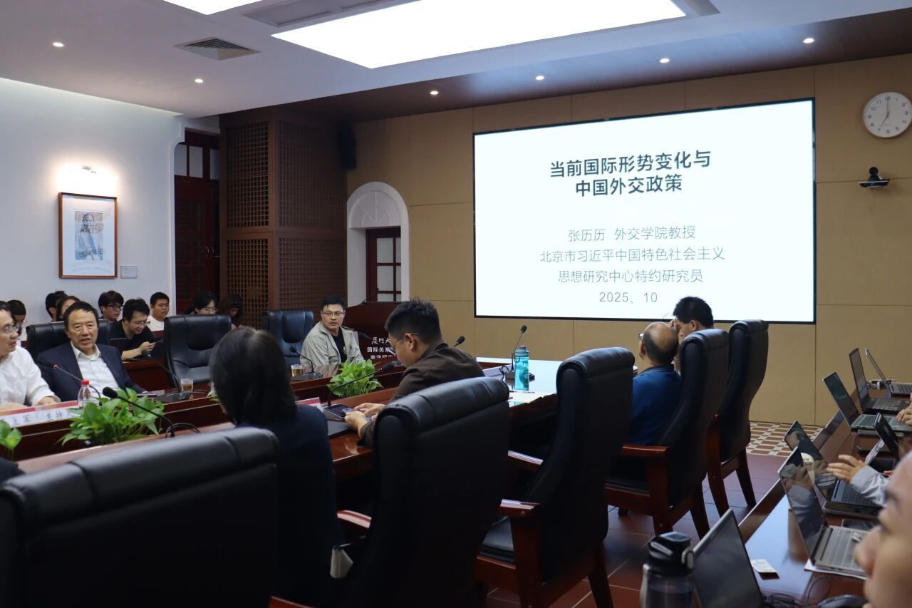 2025年10月23日晚,“观世界”系列讲座第八讲在厦门大学南安楼301-3会议室举行。本次讲座特邀中国外交学院资深教授、外交学博士生导师、中国外交研究中心主任张历历主讲,主题为 “当前的国际形势与中国外交热点”。