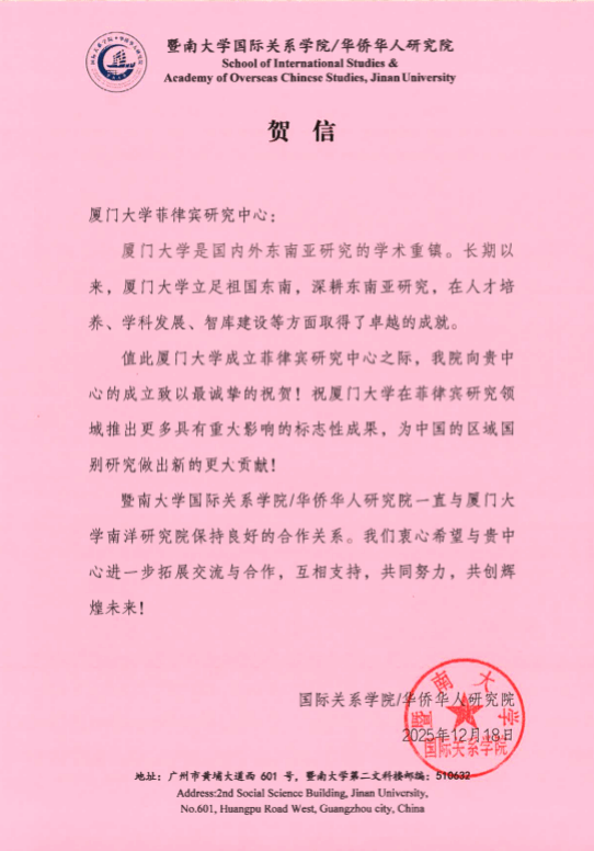 施雪琴教授在致辞中强调:“这些深厚的历史渊源,不仅印证了在厦门大学深耕菲律宾研究的独特价值,更向我们传递着一种历史使命。希望菲律宾研究中心能在前辈奠定的基础上,共同培育更具深度与创新的学术成果,为增进中菲两国人民之间的相互理解,以及中菲关系在各领域的健康发展,贡献知识与智慧。”
