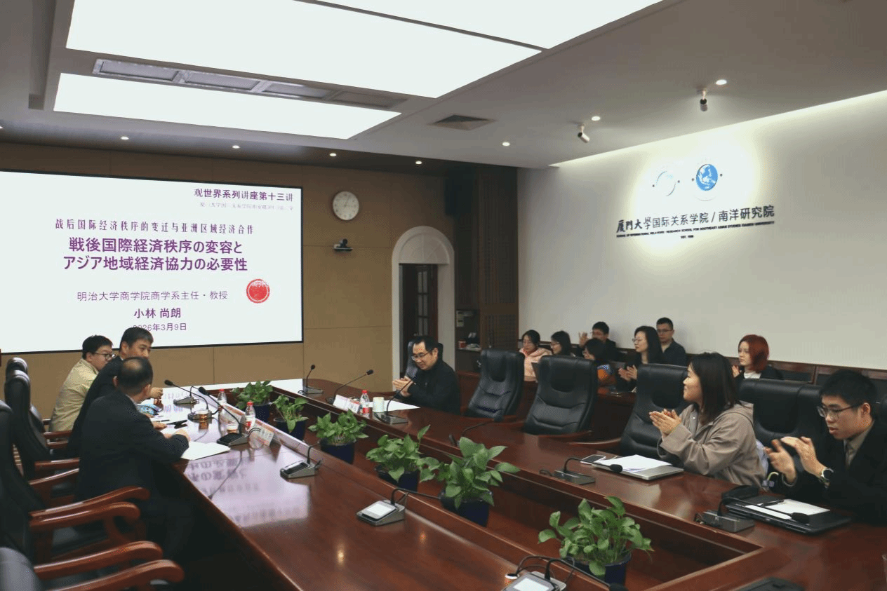 2026年3月9日下午,“观世界”系列讲座第14讲在厦门大学南安楼301-3会议室举行。本次讲座特邀日本明治大学商学院商学系主任、教授,日本国际经济学会理事小林尚朗主讲,主题为“战后国际经济秩序的变迁与亚洲区域经济合作”。