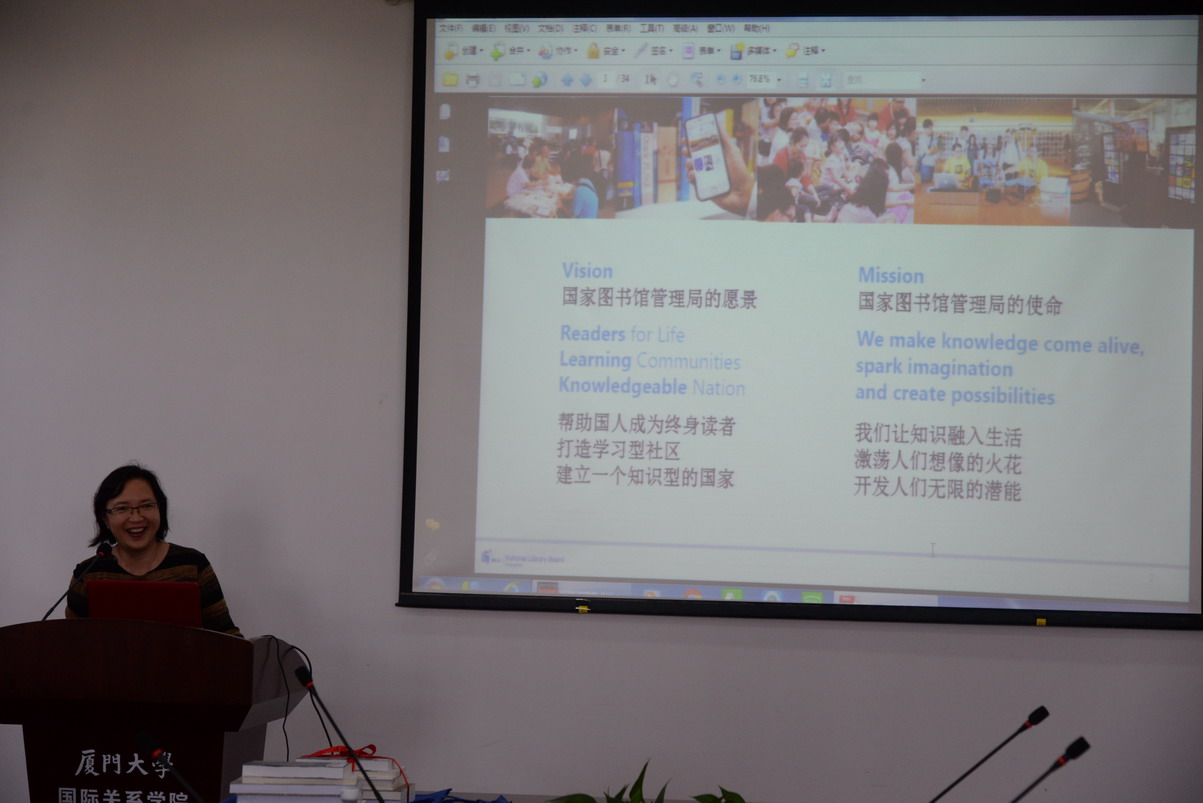 接着,洪小玲女士介绍了新加坡国家图书馆管理局的核心板块、馆藏布局、公共服务,以及终身学习图书馆的设立,展示了正在逐步完善或规划的资料项目:一站式数码化的新加坡与东南亚资料网站、“放眼亚洲”资料中心、东南亚数码图书馆、新加坡数码化资源项目、生物多样性遗产图书馆项目等等。