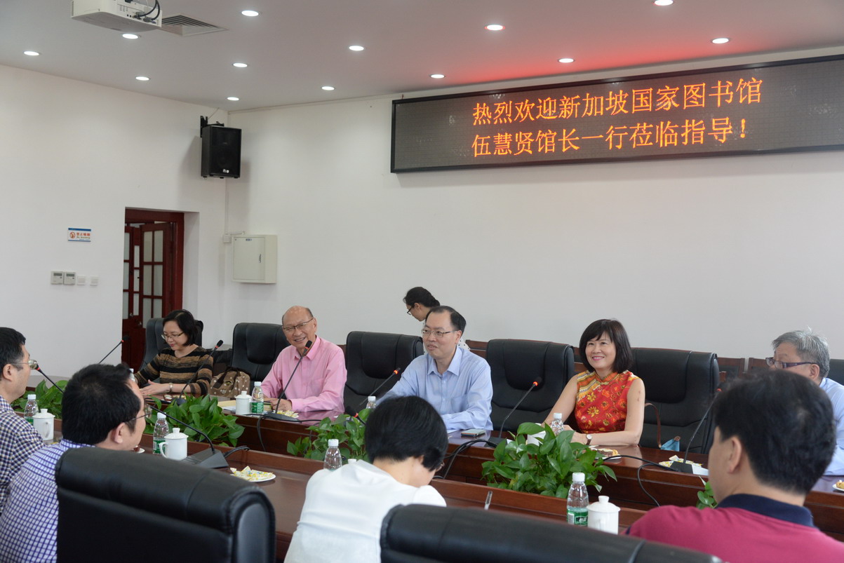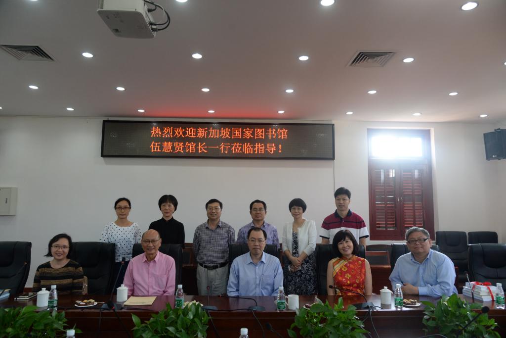 2018年5月14日下午,新加坡国家图书馆馆长伍慧贤女士、新加坡驻厦门总领事馆总领事池兆森先生、新加坡国家图书馆咨询委员会委员柯木林先生、新加坡国家档案馆助理处长叶进泉先生、新加坡国家图书馆高级馆员洪小玲女士莅临我院,本院副院长吴崇伯教授、沈惠芬副教授、冯立军副教授、张长虹副研究馆员、吴文智馆员、姚晓静工程师、朱鸿婕秘书参加了座谈。