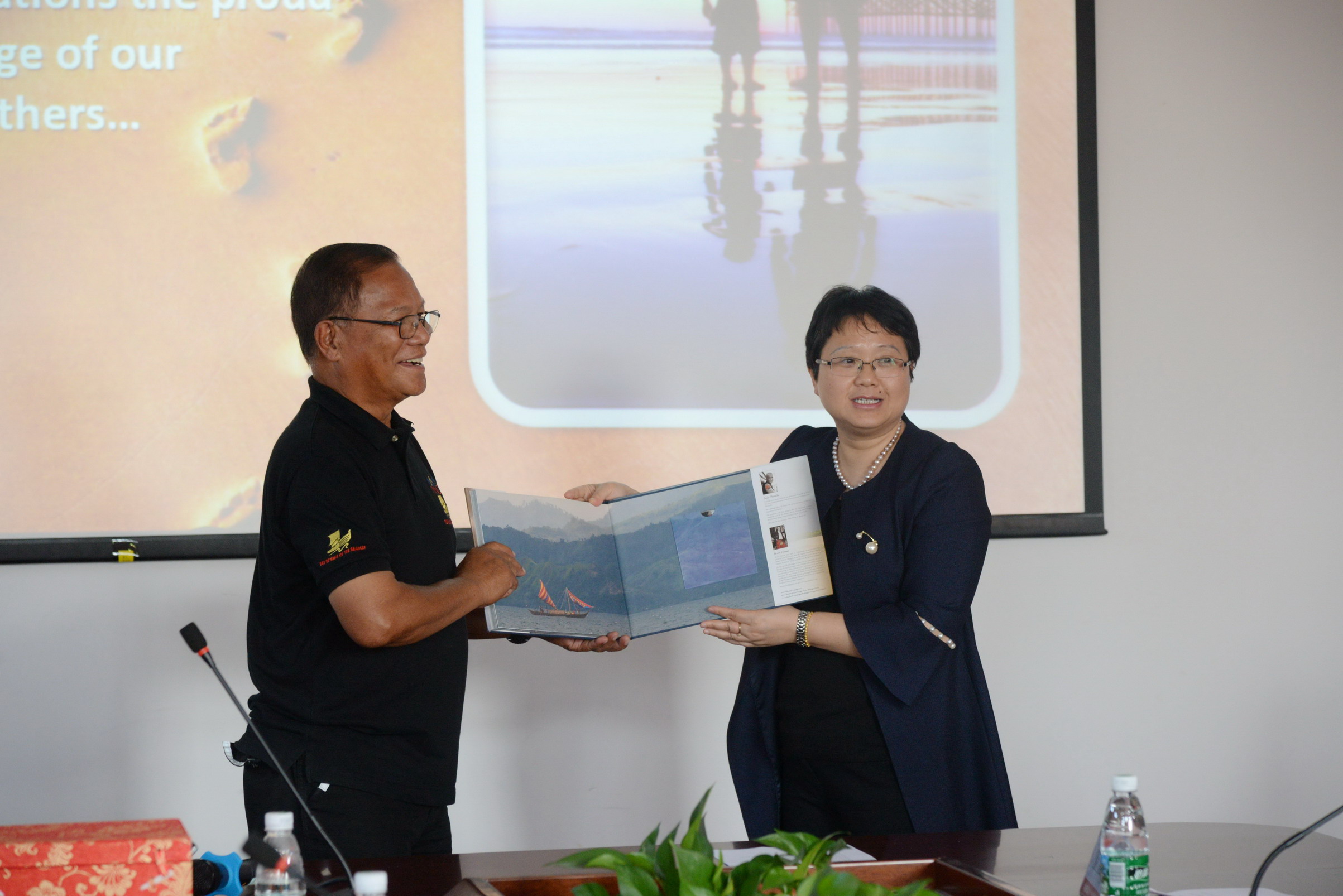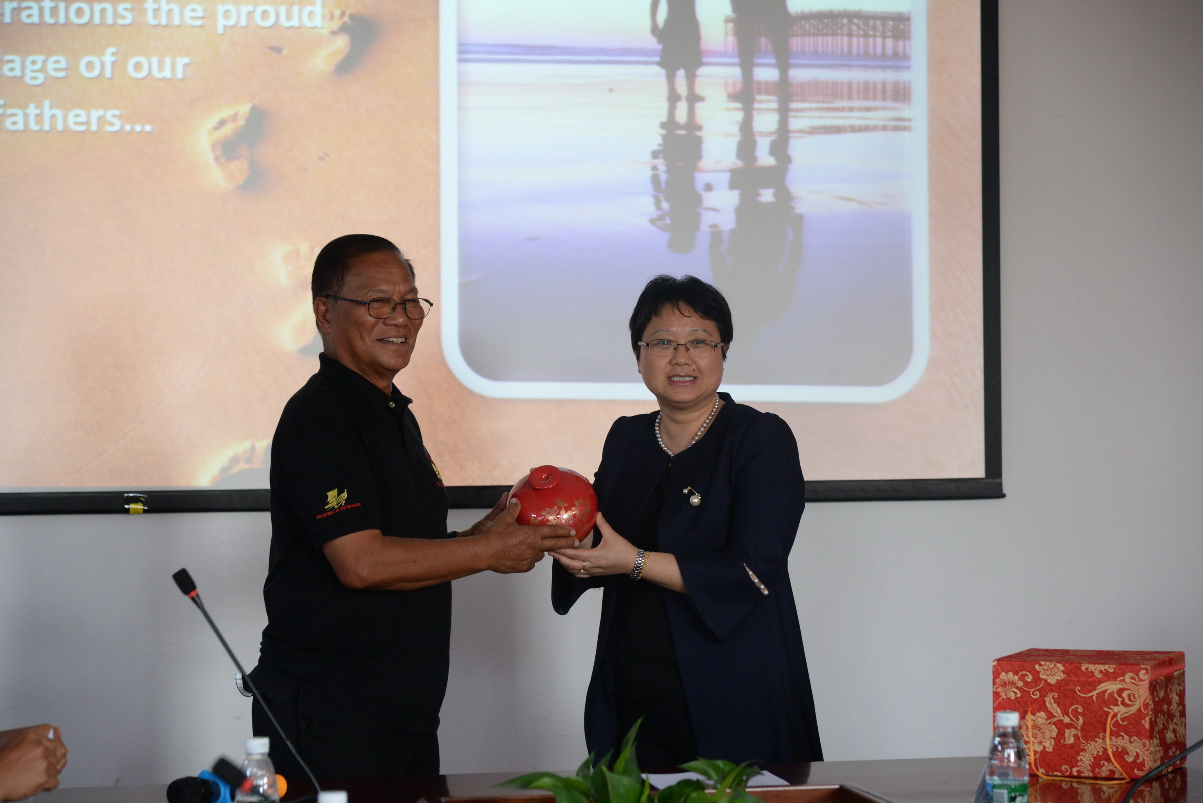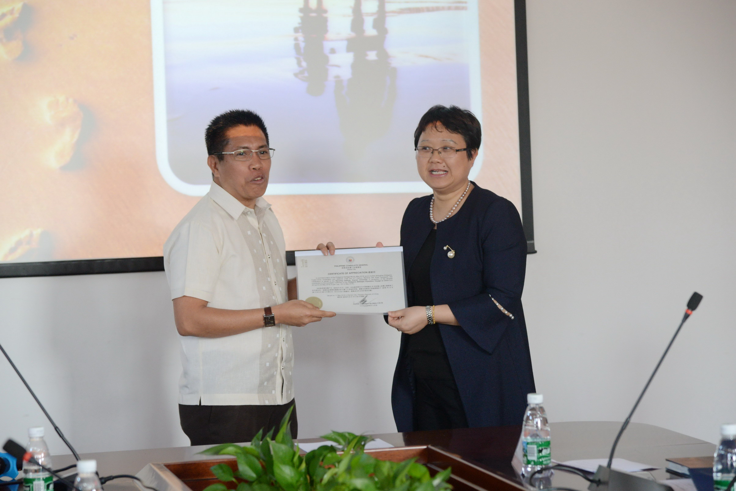 讲座结束后,施雪琴教授代表学院赠送礼品以及荣誉证书,表达对Arturo T.Valdez先生的感谢,菲方也回赠礼物,表达了双方加强合作的殷切希望和中菲友谊长存的美好愿景。