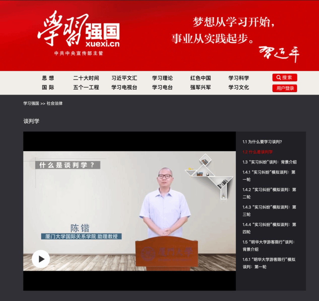 作为厦门大学国际政治、外交学专业的专业选修课程,“谈判学”课程主动服务“一带一路”建设和人类命运共同体建设,将线上课程与课堂教学结合(每学年开设一期两学分的线下课程),旨在帮助学习者系统掌握谈判的基本原则、方法与技巧,并能在不同情境下灵活运用,以应对未来工作、学习与生活中可能面临的各类谈判问题。