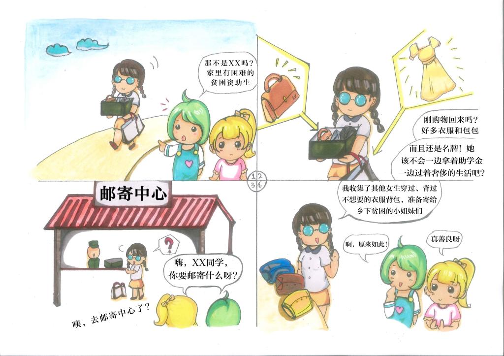 其中,我院积极配合征集工作,由2019级中国史硕士研究生魏润凡创作的原创漫画作品《美丽的误会》荣获二等奖。作品以A4纸为载体,通过马克笔手绘上色的形式,用三个原创Q版角色传达出一个正能量的故事,作品讲述了一位朴素善良的主角经过配角误会,最后真相大白。