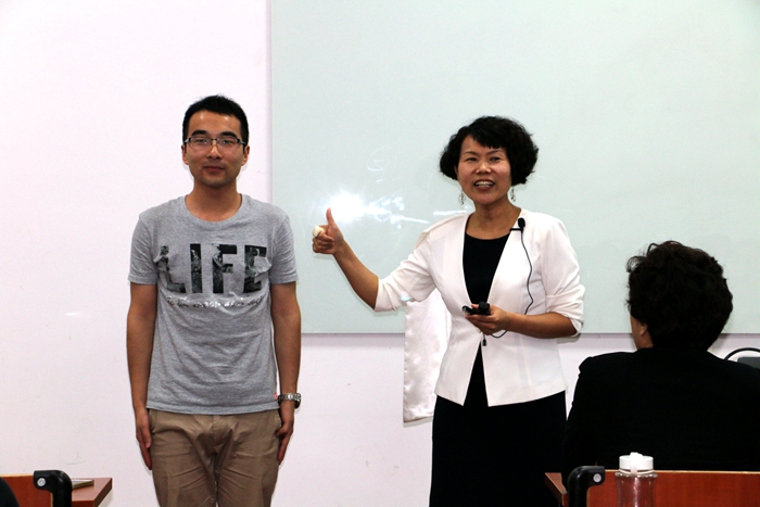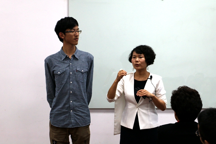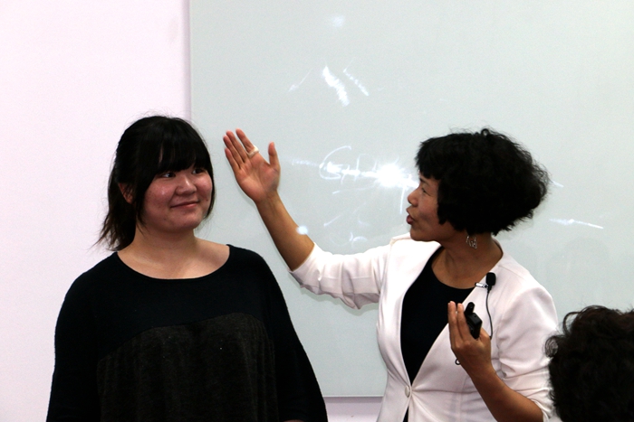 ·论发型对一个人的重要性(好吧,这是小编自己加的名字):Sophia首先给出了几种常见的脸型,圆脸、方脸、倒三角等,给圆脸的建议是提升高度,尽量用外扩的方法而不是遮【此处模特为杨宇同学】,后来在同学们的要求下,Sophia又以吉润一聃为例,讲说了长脸应该遮住一部分额头或者增加宽度来使脸型看上去和谐。