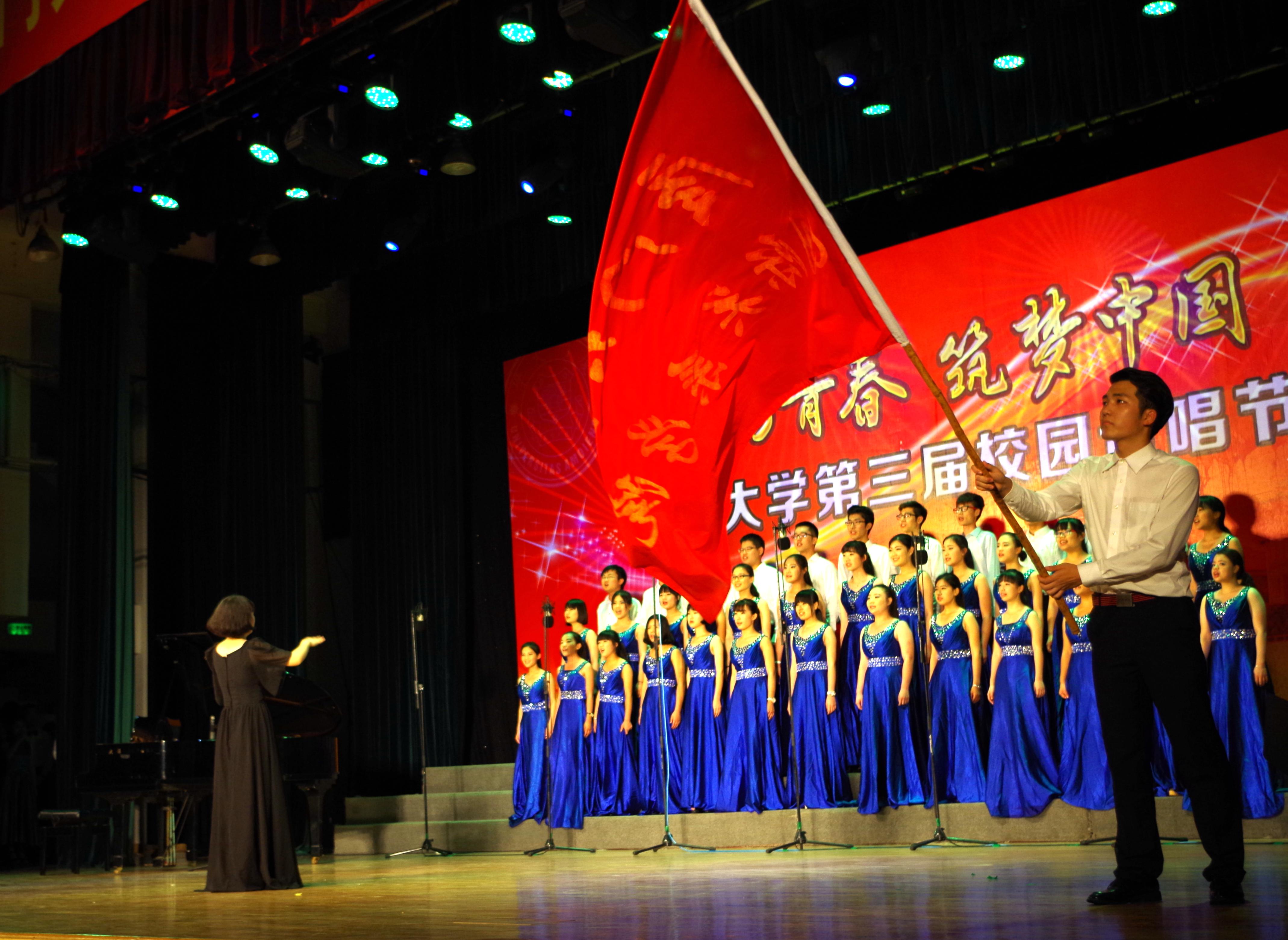 下午三点,部分参加演出的同学们就早早来到了南安楼,开始了化妆、服装、练声等各方面一系列的准备。开场后不久,便轮到了国关合唱团上台演唱。从“五星红旗迎风飘扬”开始,到“从今走向繁荣富强”结束,整场合唱大家精神高昂,声音铿锵有力,完美演绎出了歌曲中的革命精神和万丈豪情。值得一提的是,虽然国关合唱团在男生数量上稍有劣势,但是他们在今天的表演中爆发出了巨大的能量,成功地弥补了人数上的不足。在所有队伍表演结束后,全场大合唱的《共青团员之歌》为这次汇演画上了圆满的句号。