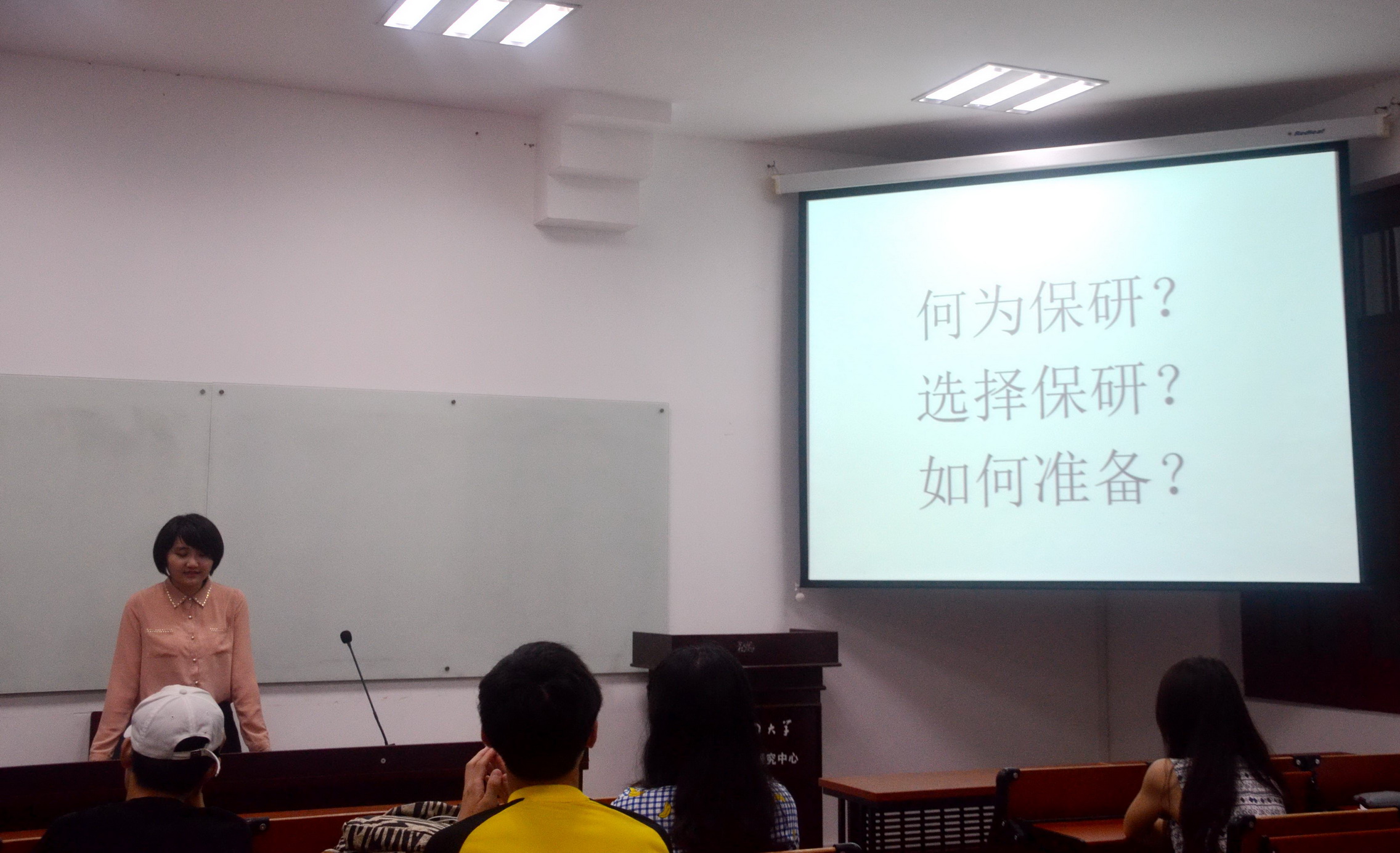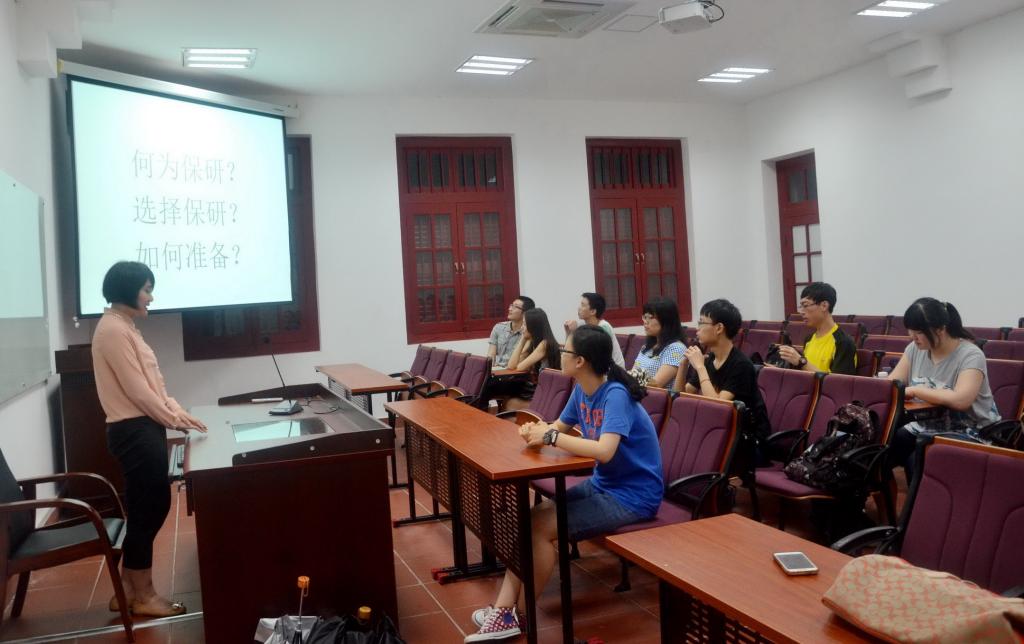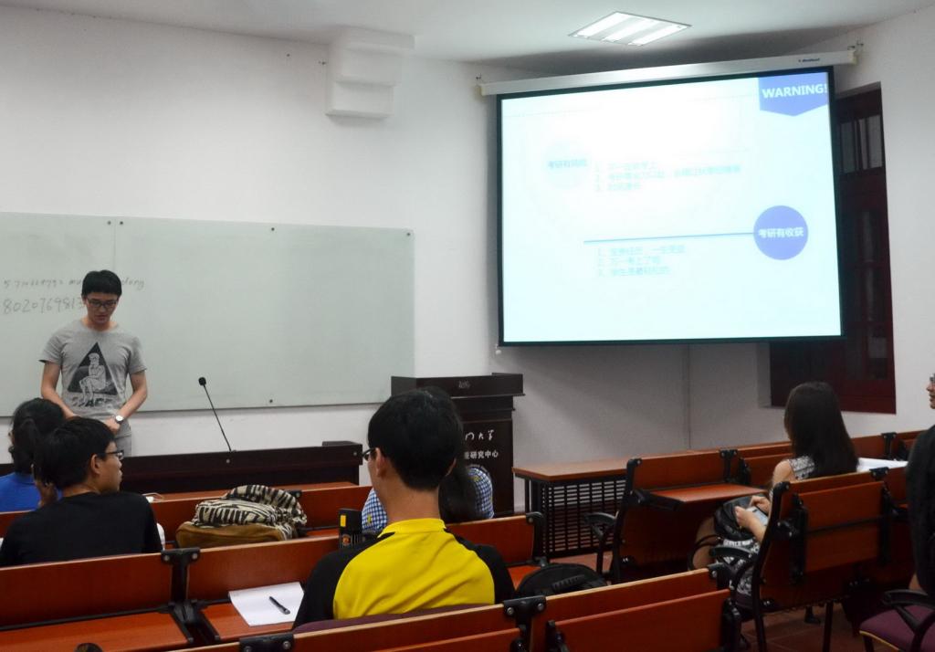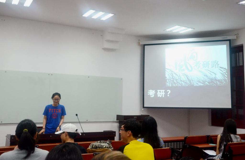 2015年5月31日19时10分,由学术部主办的大四学姐学长交流会在南安楼103举行,此次交流会旨在为学弟学妹们解答关于保研、考研、出国的各类疑惑。本次交流会到场的学长学姐共有六位。学姐学长们以聊天的方式为同学们传授经验,并且分享自身经历,让同学们收获很多。